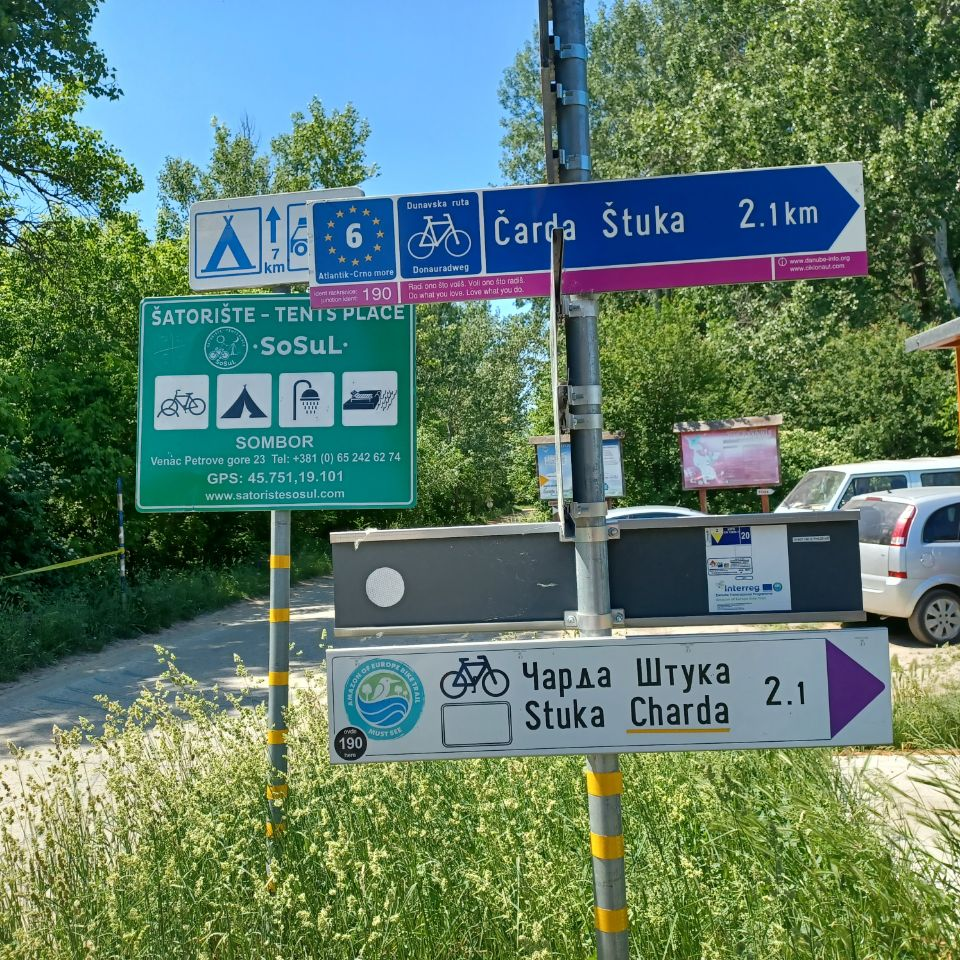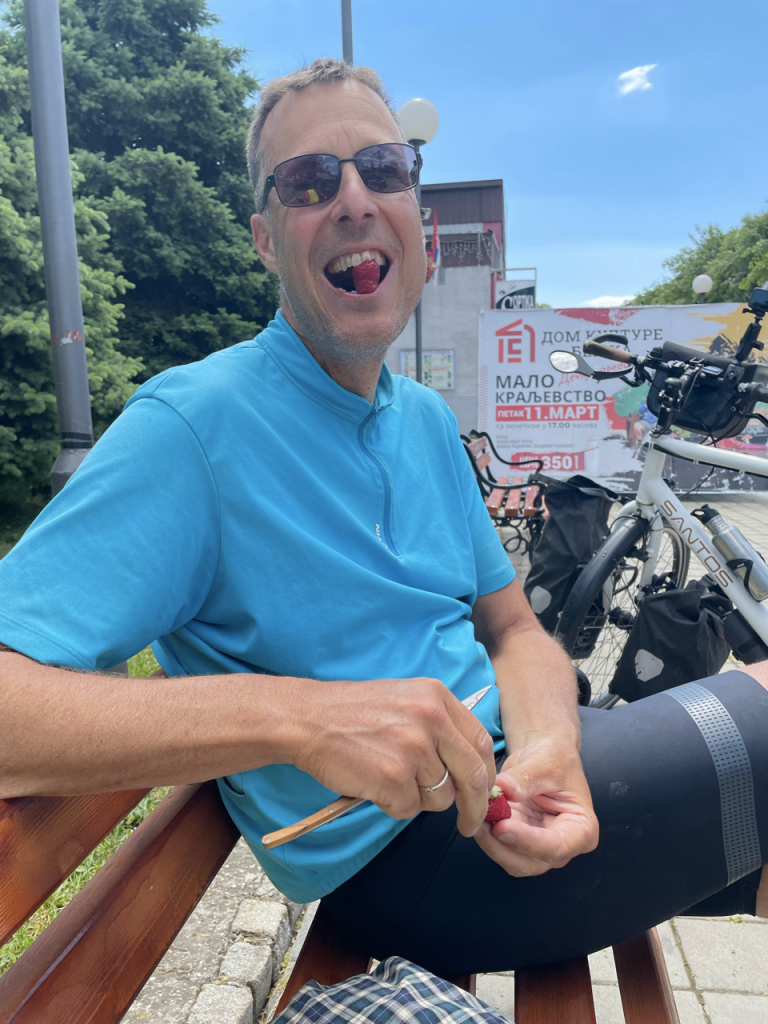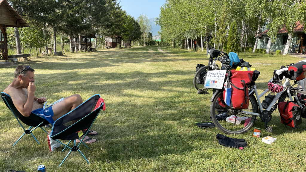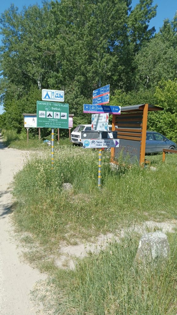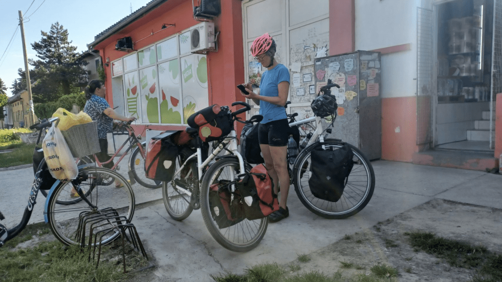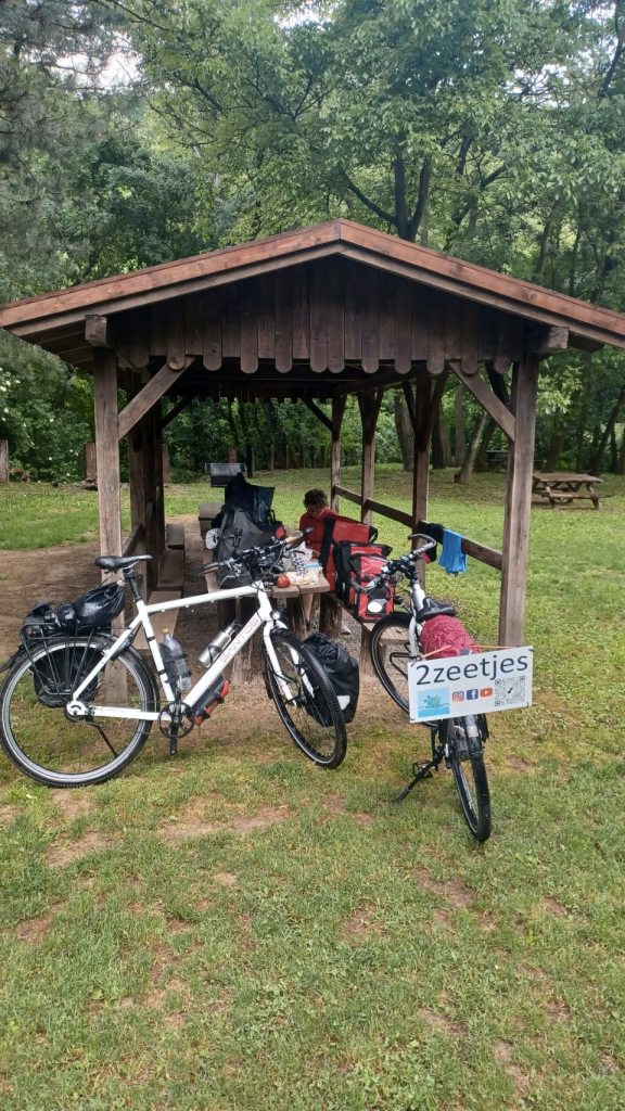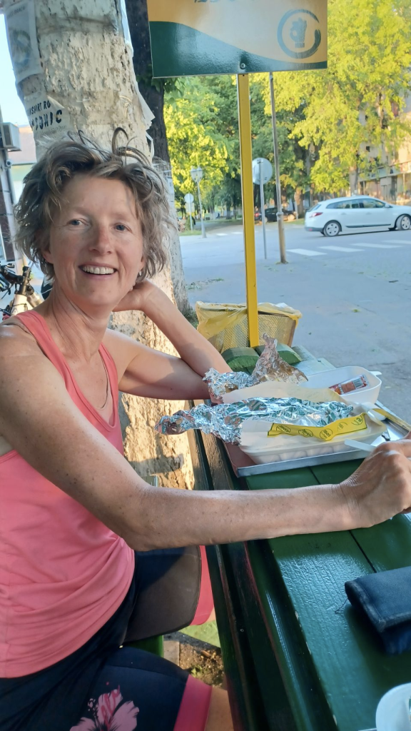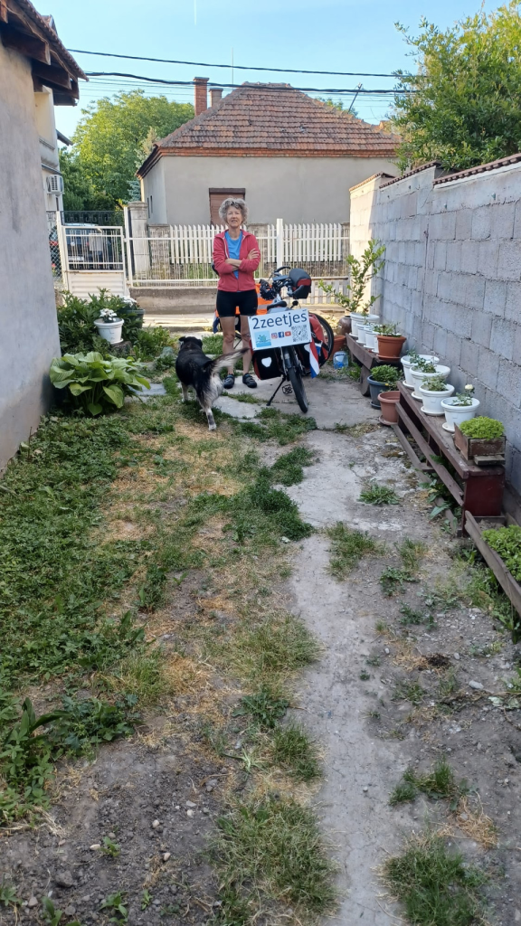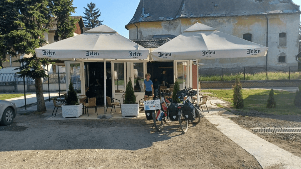 Vanaf de Camping in Zenum, 10 km voor Belgrado, door de stad naar het zuid oosten gefietst. De stad gaan we uit via een lange stijgende weg. De buitenwijken liggen in een heuvelachtig gebied. Dus een hoofdweg die gedeeld moet worden met alle verkeer🙄😟. Lekker uitlaatgassen happen… Koffie gedronken op een terrasje bij de supermarkt MAXI waar we ff wat lunch boodschappen doen. Lekker geluncht in een speel tuintje in een dorpje ergens onderweg.. wat een troep. Ze gooien hier alles van zich af. Wel bankje in de schaduw gelukkig. Weer op weg worden we ingehaald door een wielrenner die, naar later blijkt, een foto van ons bord heeft gemaakt en ons later noemt in een Instagram bericht! Dat is cool! We hebben een warmshowers host gevonden in Grocka: Nenad. Heel gastvrij, als tegenprestatie en omdat zijn budget nogal “low” is, nemen we hem mee uit eten en we wandelen langs de Donau. In dit plaatsje zijn in de zomer meerdere festivals maar nu is alles nog rustig. Nenad werkt in een fietswinkel in Belgrado en moet ‘s morgens al om 7 uur weg. Wij zijn dus ook vroeg op en gaan lekker ontbijten bij de lokale bakker ☕️. We krijgen van de buren nog een fles vlierbloesemsiroop en een potje paprikaspread. Ontzettend lief en, zoals later blijkt, ook erg lekker 😋!