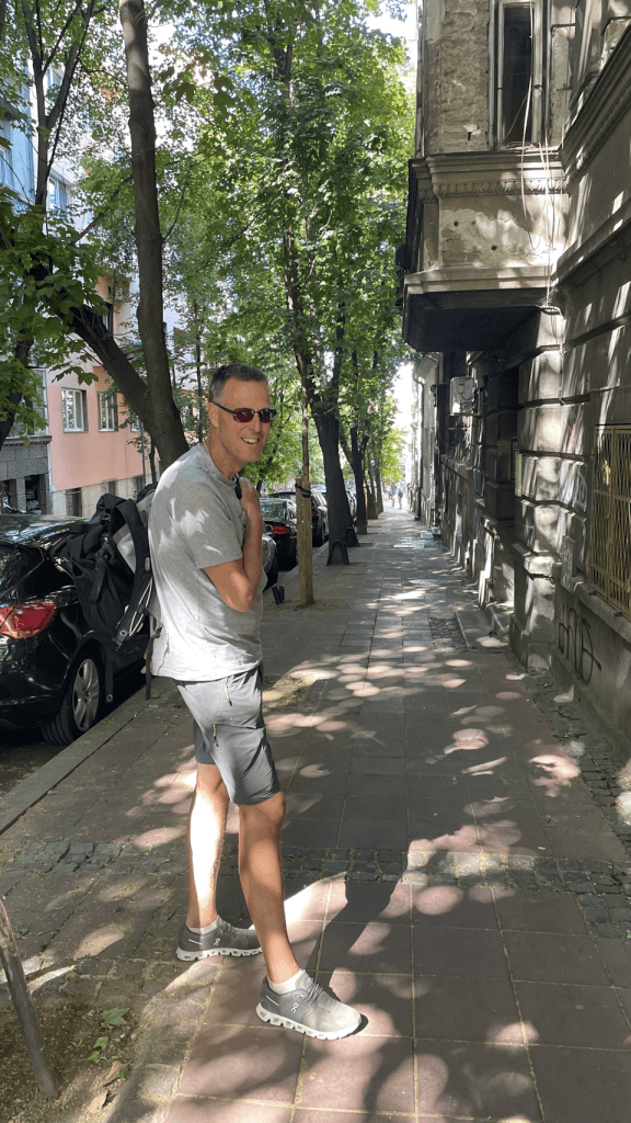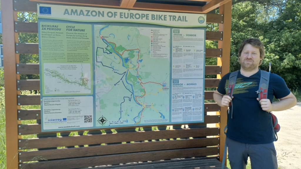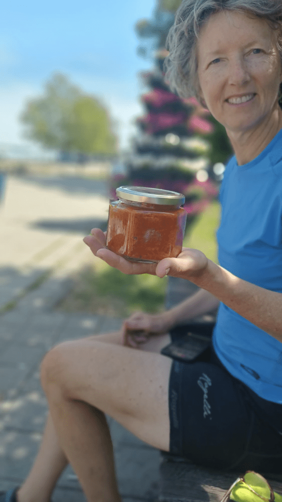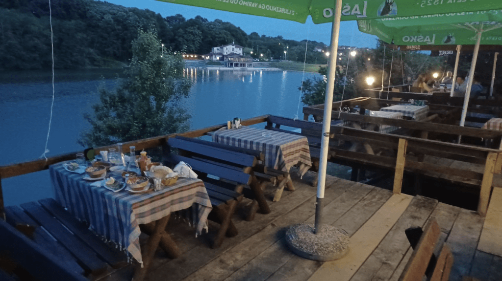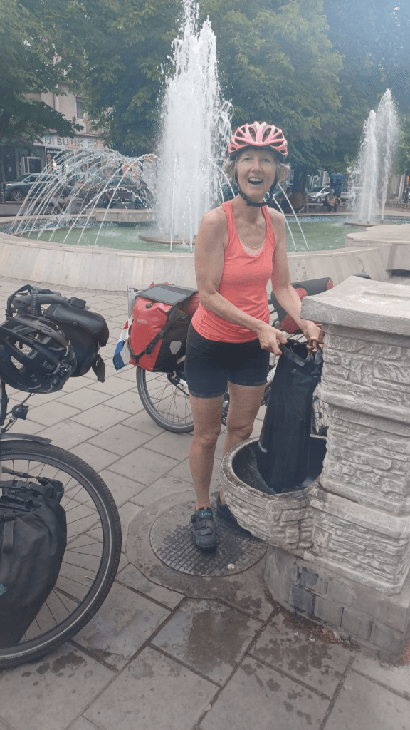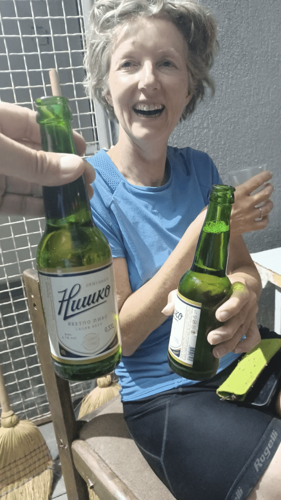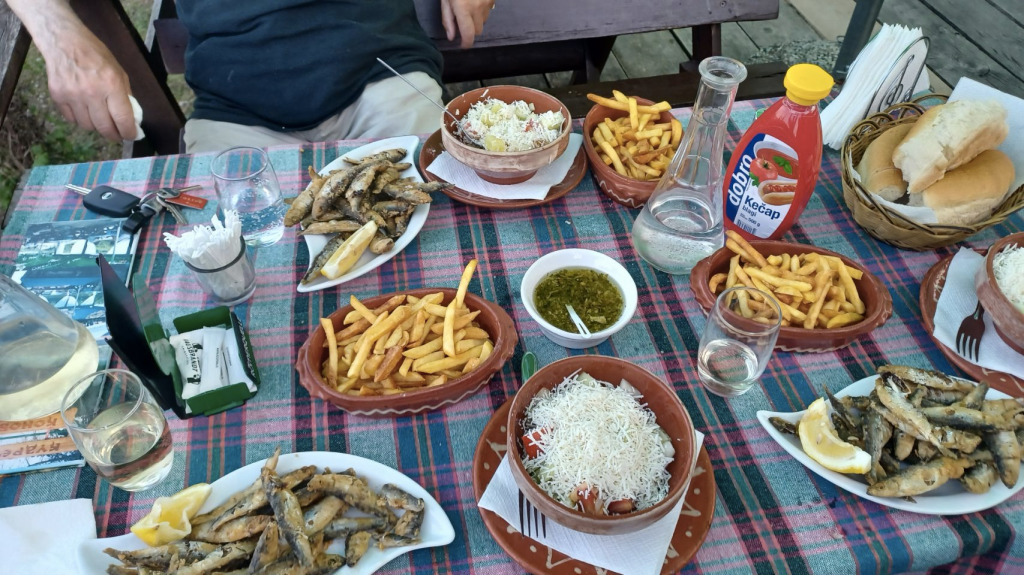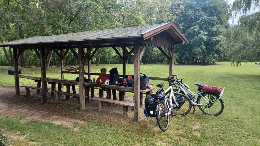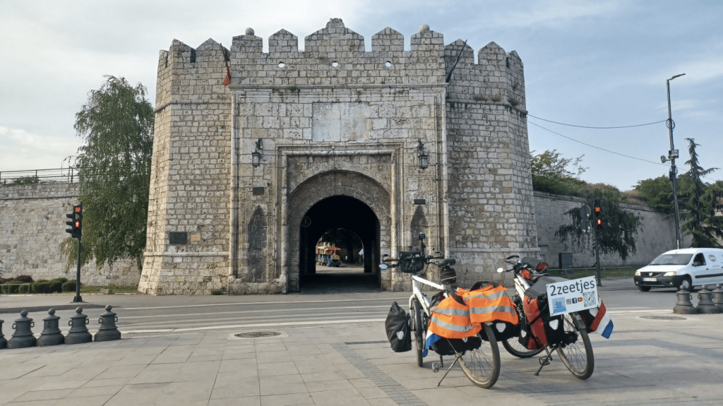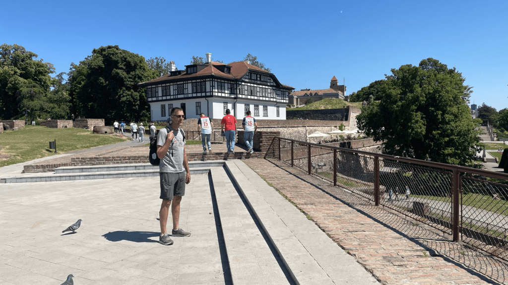 Vanaf de Camping in Zenum, 10 km voor Belgrado, door de stad naar het zuid oosten gefietst. De stad gaan we uit via een lange stijgende weg. De buitenwijken liggen in een heuvelachtig gebied. Dus een hoofdweg die gedeeld moet worden met alle verkeer🙄😟. Lekker uitlaatgassen happen… Koffie gedronken op een terrasje bij de supermarkt MAXI waar we ff wat lunch boodschappen doen. Lekker geluncht in een speel tuintje in een dorpje ergens onderweg.. wat een troep. Ze gooien hier alles van zich af. Wel bankje in de schaduw gelukkig. Weer op weg worden we ingehaald door een wielrenner die, naar later blijkt, een foto van ons bord heeft gemaakt en ons later noemt in een Instagram bericht! Dat is cool! We hebben een warmshowers host gevonden in Grocka: Nenad. Heel gastvrij, als tegenprestatie en omdat zijn budget nogal “low” is, nemen we hem mee uit eten en we wandelen langs de Donau. In dit plaatsje zijn in de zomer meerdere festivals maar nu is alles nog rustig. Nenad werkt in een fietswinkel in Belgrado en moet ‘s morgens al om 7 uur weg. Wij zijn dus ook vroeg op en gaan lekker ontbijten bij de lokale bakker ☕️. We krijgen van de buren nog een fles vlierbloesemsiroop en een potje paprikaspread. Ontzettend lief en, zoals later blijkt, ook erg lekker 😋!