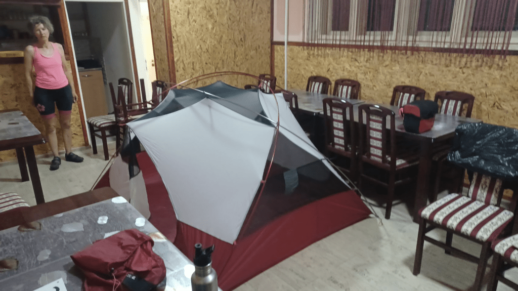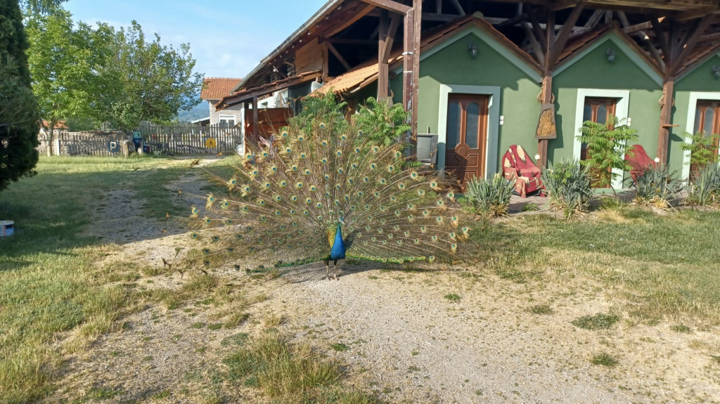 Vanuit Bela Pelanka, lange helling maar gelukkig niet zo steil als aangegeven in de routebeschrijving: zou 10 km van 10% zijn maar dat viel reuze mee. Onderweg met de drone gevlogen. Na de top vrij eenvoudig Pirot binnengereden en lekker koffie gedronken. Ons bord had blijkbaar de aandacht van een journalist getrokken want we werden aangesproken en gevraagd om aan een reportage mee te werken voor locale en landelijke nieuwssite. Dat hebben we natuurlijk gedaan, extra aandacht voor ons goede doel! Na Pirot onze weg vervolgd. We kwamen nog een jonge Fransman tegen die in tegengestelde richting fietste. Allemaal heel gezellig, dus het fietsen schoot niet heel snel op en geheel onverwacht kwamen we een camping tegen, dus besloten daar te overnachten. De eigenaar durfde €20 te vragen, en dan zelfs zonder een warme douche. Het kostte best wat overredingskracht om voor het best wel hoge bedrag naar lokale norm, in ieder geval een warme douche te hebben. Het veld was mooi, sanitair hééél eenvoudig maar een emmertje water voor de wc werkt ook 🤗. Vergane glorie… En veel pauwen op de camping! Aangezien we bedacht hadden de grens al over te zijn waren onze Dinars al zo goed als op maar gelukkig konden we camping en boodschappen met euro’s betalen 😁