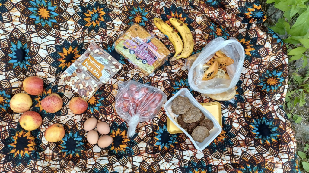 17 km vanaf de camping naar de grens. Het was veel rustiger dan verwacht, maar wel een heel aantal Duits-Turkse mensen op weg naar Turkije. Heel gezellig gebabbeld met iedereen, terwijl we stonden te wachten in de rij. Ze wilden allemaal weten waar we heen gingen en we werden overladen met eten! Ontzettend lief! Direct na de grens waren er wegwerkzaamheden waar we al voor gewaarschuwd waren. Er zou niet te fietsen zijn, maar gelukkig viel dat reuze mee en na enkele km konden we de snelweg in aanbouw verlaten en onze tocht via de oorspronkelijke kinderkopjes weg vervolgen. Niet makkelijk, wel lekker in de schaduw. Maar eerst hebben we gelunched met al het lekkers dat we gekregen hadden…