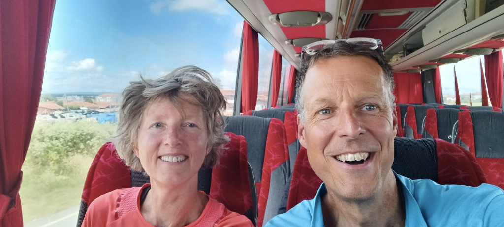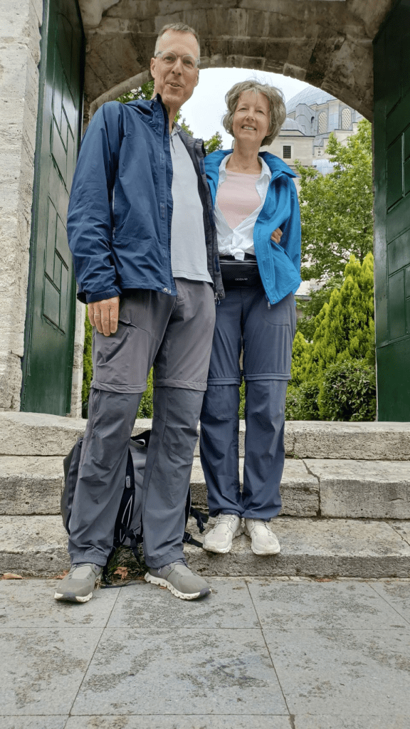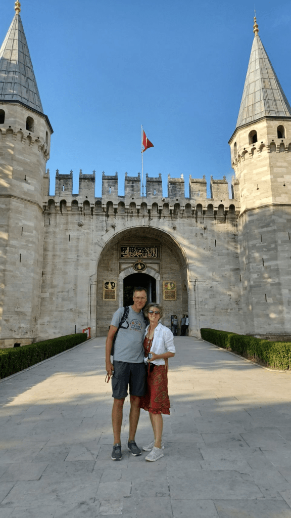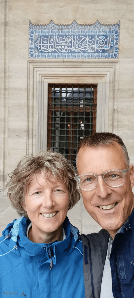 Wat een stad. Istanbul heeft 15 miljoen inwoners en ligt als enige stad ter wereld op 2 continenten, nl. Europa & Azië, gescheiden door de Bosporus. We zullen hier 4 nachten / 3 dagen blijven. Als eerste bezoeken we de wijk met de oude moskeeën, zowel de Hagi Sophia Moskee als de Sultan Ahmet moskee, die vanwege zijn kleur de Blauwe Moskee genoemd wordt. We gaan er met metro en tram naartoe. Dat is hier allemaal prima geregeld, alleen de tram was echt mudje vol. De wijk heet Eminönü en wordt omsloten door de Zee van Marmara (zuid), de Bosporus (oost) en de Gouden Hoorn (noord). Het is echt “the place to be” voor de toeristen. We stappen uit bij halte Sultanahmet, lopen naar het Sultanahmet plein 😁 en zien de pracht en praal voor ons. Irma wil eerst de Hagi Sophia Moskee in, de speciaal daarvoor meegenomen shawl gaat om en na een korte wachtrij staan we in deze machtige moskee. Hij is groot, mooi en boordevol toeristen. Daarna tussen de palmbomen door naar de Blauwe Moskee, maar die is tijdelijk dicht i.v.m. het gebed. Dan eerst lunchen. We vinden een heerlijk rustig restaurantje net buiten alle hektiek bij de Kleine Hagia Sophia Moskee. Dan terug naar de Blauwe Moskee, want die moeten we gezien hebben. Eenmaal binnen, blijkt dat de moskee gerenoveerd wordt en dat het interieur en de prachtige koepels en plafonds nauwelijks zichtbaar zijn. Dat wel echt een tegenvaller. Derde op de lijst is het Topkapi paleis…nou top was het. Echt een prachtig paleis, met hele mooie tuinen, waar vroeger de Sultans gewoond hebben. Schitterend uitzicht over de Bosporus en op het Aziatische deel van de stad. Dit voelt ineens als het einddoel van het eerste deel van onze reis. We wisten het al, maar beseffen het nu…..we zijn 2000km naar Istanbul gefietst. ’s Avonds eten we op de stoep bij een klein döner restaurant. Drie broodjes en 2 cola zero kosten 80 TL ( Turkse Lira) en dat is ongeveer € 4,50 🤣.