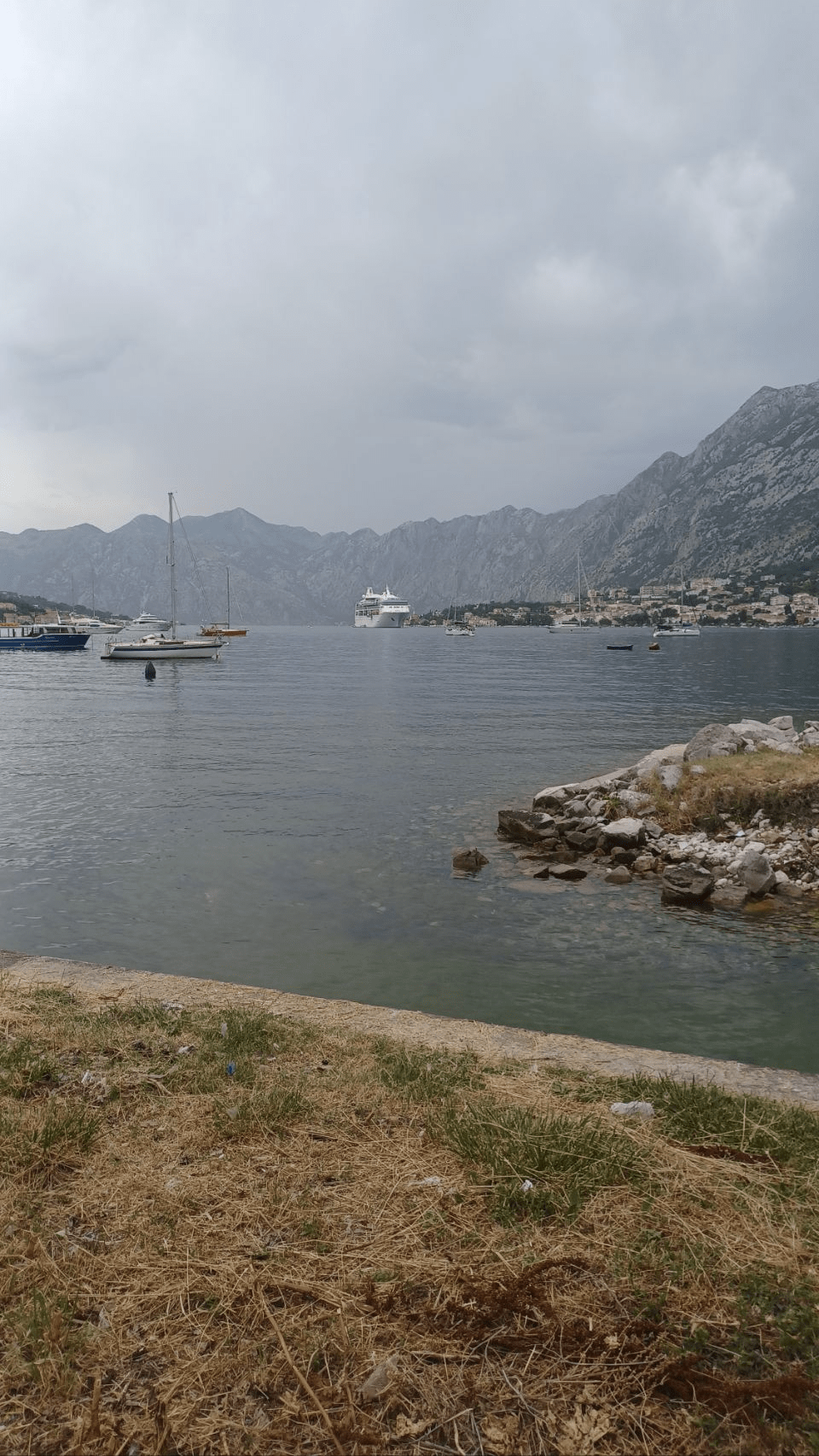 We ontbijten op de camping, heerlijk aan de rivier. We hakken 2 espresso’s weg bij de camping bar, zeggen gedag aan onze Duitse fietsvrienden en vertrekken naar de bus in Shkoder. Om 10 uur proberen we naar Kotor te reizen, omdat het te warm is om een aantal van de zwaarste beklimmingen van de route – tot wel 1400m hoog, te omzeilen. Gelukkig is er ruimte voor de fietsen, maar tijdens het eerste deel van de reis tot aan de grens met Montenegro zijn er 5 zitplaatsen te weinig in de bus en wij hebben geen zitplek. Irma mag op een handdoek naast de chauffeur zitten in het gangpad. Overboekt, hoe is het mogelijk🤔. Via Podgorica, de hoofdstad van Montenegro gaan we via Budva naar Kotor. Die “zwarte bergen” zijn mooi en bij Kotor heel hoog en steil. Rond 14h30 komen we daar aan. Nog even rondkijken in Kotor, avondeten kopen, en dan nog 10km fietsen langs de baai naar de camping. Het is sinds lange tijd weer zwaar bewolkt, soms een spettertje regen, maar nog steeds warm. De camping is klein en vol, het sanitair oud. Wel een leuk restaurantje. Toch vraagt men €15, we komen langzaamaan in de duurdere en commerciële gebieden….