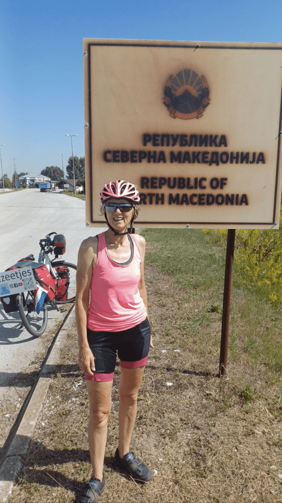 We fietsen langs de bergen in de richting van de Grieks – Noord Macedonische grens. De omgeving is prachtig, de grensovergang makkelijke en rustig. Bitola is de eerste wat grotere stad in Noord Macedonië en echt een hele leuke. Moderne mensen en het heeft een heel divers gezicht, saai Sovjet-Joegoslavisch, oude rijk gedecoreerde stijl, gezellige terrasjes en moskeeën. Na Bitola gaat we naar Resen en moeten we van 600m hoog een pad over van 1200m hoog. Eerst gaat het gestaag omhoog, maar aan het einde is het echt flink doorbijten. “Natuurlijk” halen we het, maar met temperaturen boven de 30° en de impact van de griep nog in Irma’s lijf is het niet eenvoudig. Het stuk naar Resen is bergaf, makkelijk en het hotel is super basic en oud, maar ja, €16 is dan ook erg goedkoop.