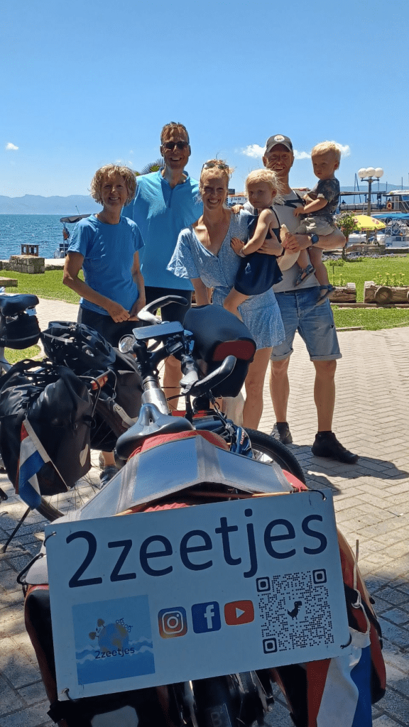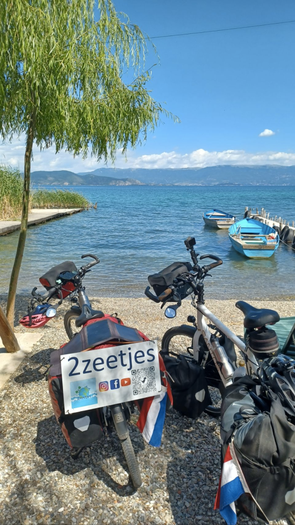 Onze 2e fietsdag in Noord Macedonië begint berg op. We moeten stijgen van ongeveer 600m naar 1200m. Dit gaat eigenlijk prima en de afdaling richting Ohrid is heerlijk lang, dus we gaan niet te hard naar beneden – ruim 40 km/uur zonder te veel te hoeven remmen. Vlak bij Ohrid kopen we bij één van de huis-stalletjes kersen. Er zitten overal mensen langs de weg fruit te verkopen. Ohrid is een leuk stadje aan het meer, maar wel erg toeristisch, we moeten daar erg aan wennen. We raken tijdens de lunch in gesprek met een Nederlands gezin. Mirjam Dammers en Anne Jan Bruinsma en hun kinderen reizen door de Balkan en na wat doorpraten, blijkt Mirjam de dochter van Johan en Wendy, waarmee we via Instagram contact hebben. Ongelooflijk kleine wereld blijkt het weer te zijn. We nemen een foto van ons zessen en sturen deze aan Johan en Wendy😁. Na de lunch fietsen we langs het meer naar Kališta, waar meerdere heel kleine campings zijn. We kiezen camping Lakeside, waar we samen met een Duitse man staan. Hij is 78, is alleen op reis, in zijn auto en heeft ook heel veel gefietst in zijn leven. Erg leuk om verhalen te delen. De camping heeft een prachtig uitzicht op het meer!!!