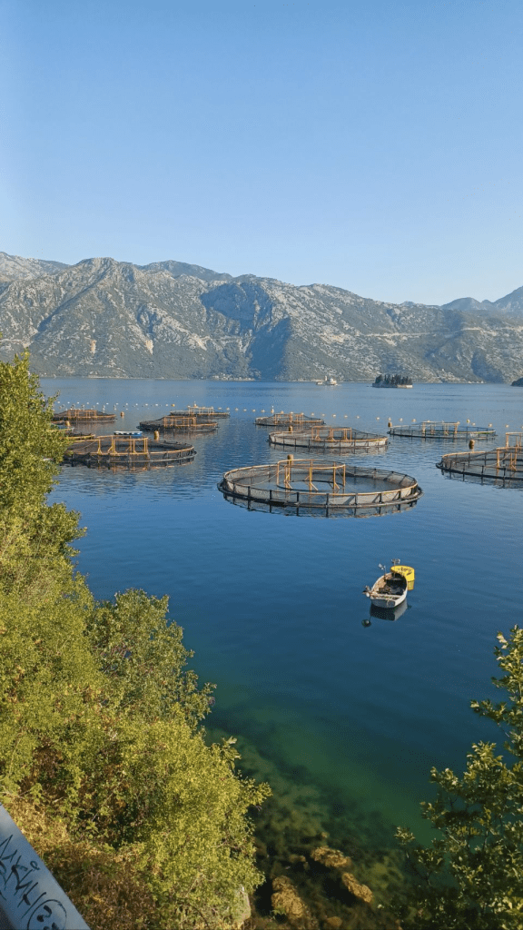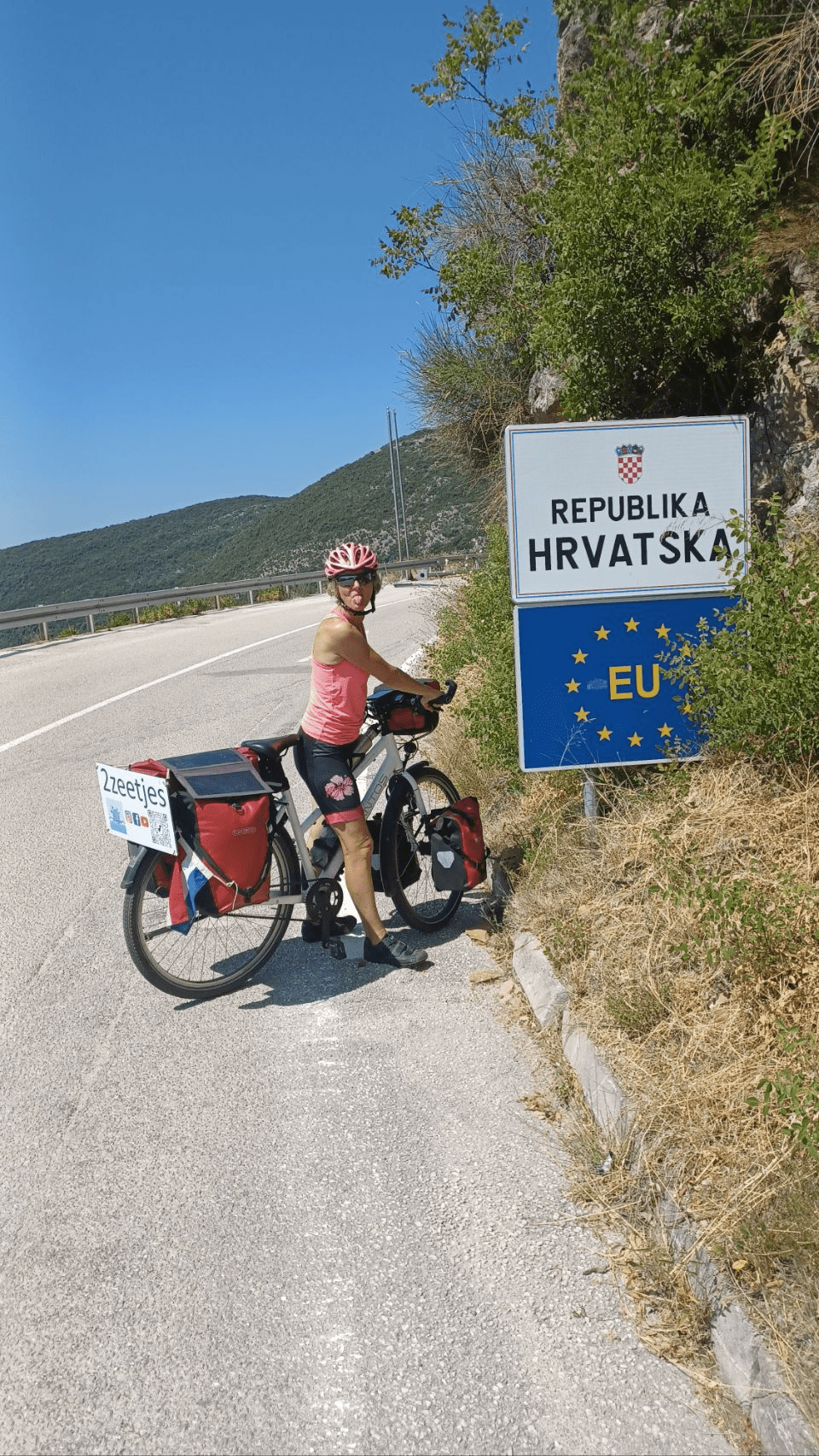 Zonder ontbijt om 7h30 op weg. Langs de prachtige baai van Kotor, maar helaas ook hier fish farms… We gaan naar de pont om aan de andere kant de route vervolgen naar Herceg Novi. Brood scoren net na de pont, aan de waterkant opeten, koffie op een terras aan het water en veel over boulevards gereden. Omdat de route eigenlijk van noord naar zuid gemaakt is, rijden we veel tegen het verkeer in over eenrichtingsverkeer wegen. Al in Herceg Novi moeten telkens stukjes klimmen. Niet heel hoog, maar in de enorme warmte, valt het niet mee. Daarna gaat het een heel stuk omhoog naar de grens met Kroatië, eerst moeten we Montenegro uit. Het is een kleine kneuterige overgang. Daarna weer in volle vaart naar beneden om bij de 2e overgang (ingang van Kroatië) te komen. We kijken tegen een enorm steile helling op. Deze is misschien 1 km lang, maar soms 10%, en dus kruipen met minder dan 5 km/u naar boven. De rest van de route gaat flink op en neer in de – en we hebben het al veel vaker gezegd / geschreven – enorme hitte. Ruim boven de 30°C strak blauwe lucht, het zuigt alle energie uit je….. Onderweg komen we Lars en Mathijs tegen. Zij fietsen van Groningen naar Istanbul, dat zijn (deels) bekende stukken voor ons 😁. Aangezien we al vroeg die dag al ons eten op hebben, de winkels dicht zijn, en geen restaurant in de buurt, Moeten we het doen met een restje pindakaas en chocolade pasta (lekkere Snickers combinatie) om weer wat energie te krijgen voor het laatste stuk van 20km. Het help wel 😄. Later ontmoeten in tegengestelde richting de Italiaanse Anne die in Maastricht is afgestudeerd en voor onbepaalde tijd aan het fietsen is. Na een lange slopende dag van 68km komen we bij de leuke camping Kate in Mlini. ’s Avonds eten we gezellig en uitgebreid aan zee. Heerlijk!!!