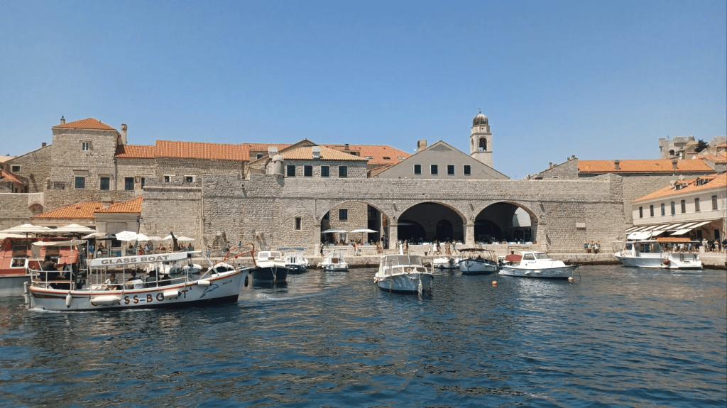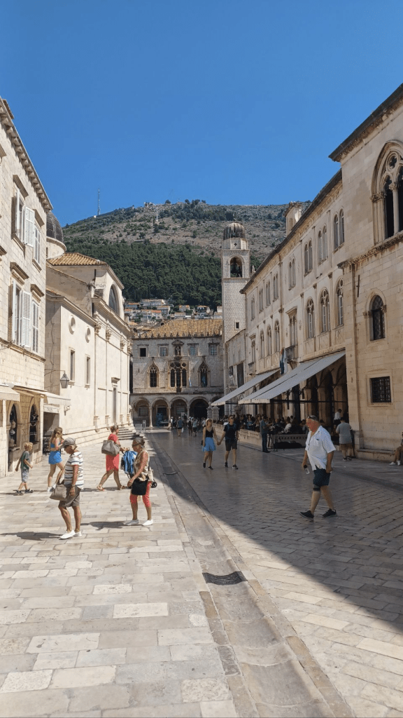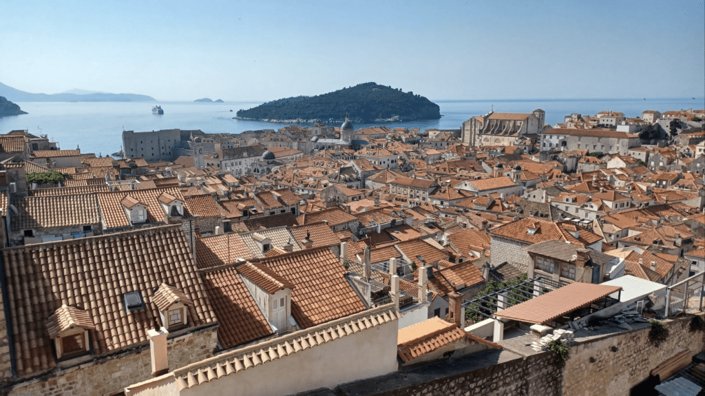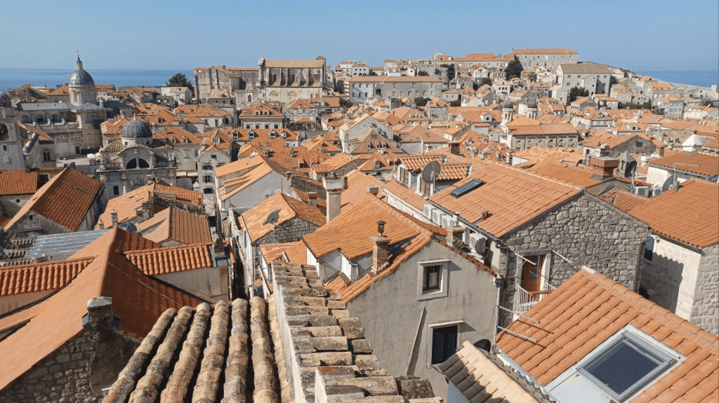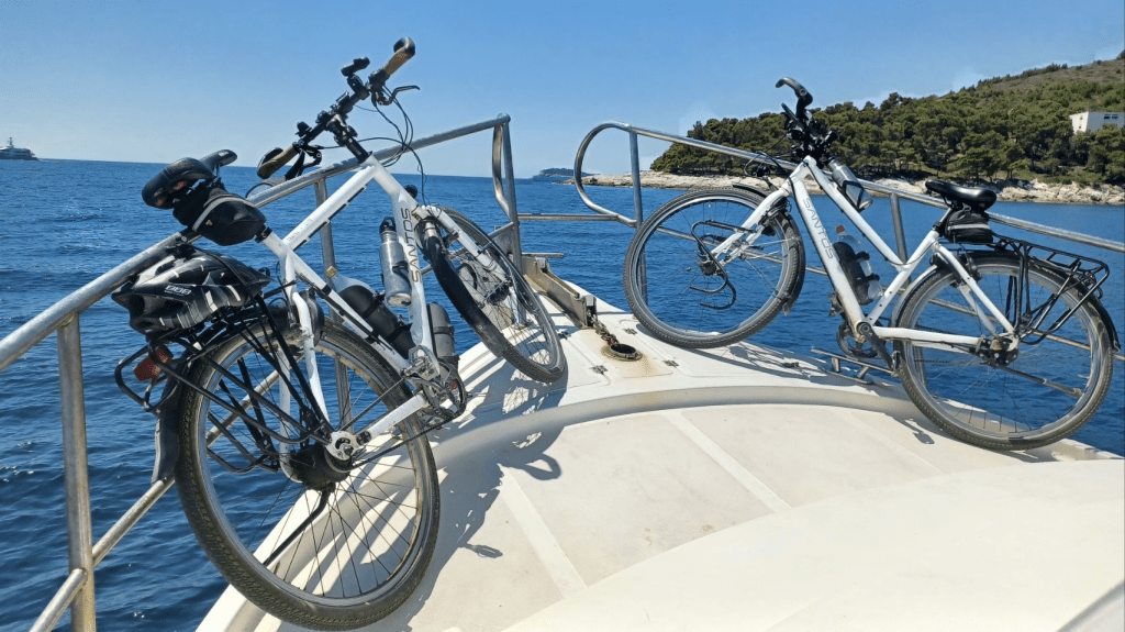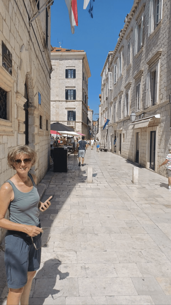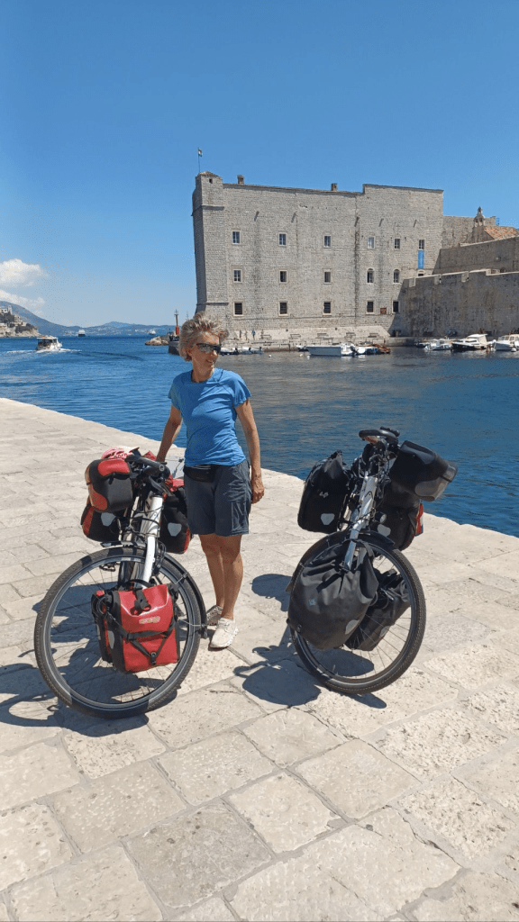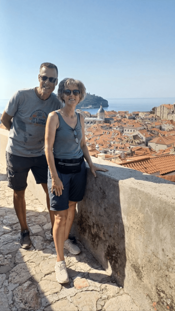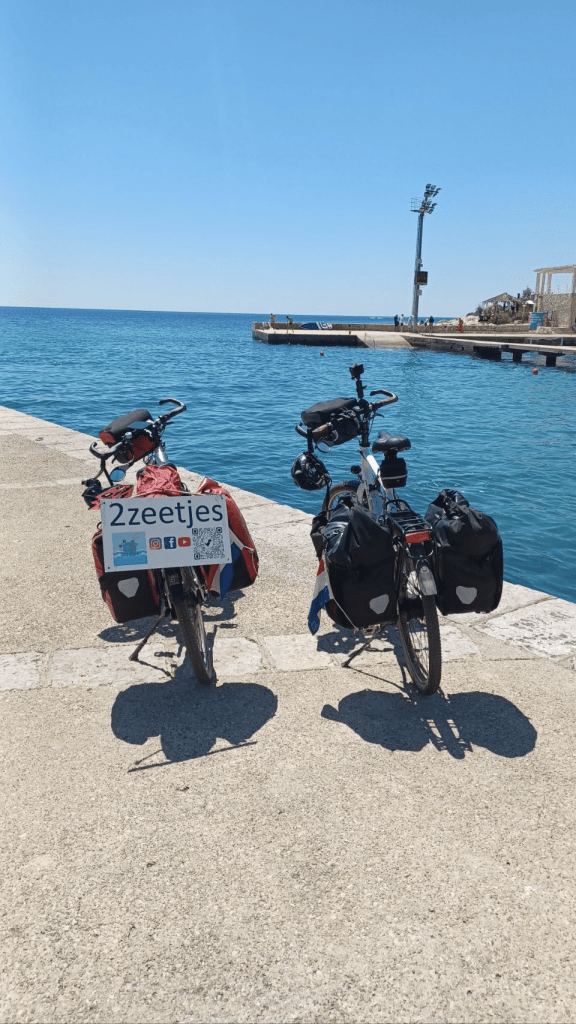 Vanuit Mlini zijn we naar Dubrovnic gegaan, ’s morgens om 7h10 met de bus heen. We bleken de verkeerde bus te hebben, omdat Sijtse niet op de buslijn let en Irma niet aangeeft dat we in de verkeerde bus stappen. Gevolg is een keer overstappen, maar we zijn nog mooi op tijd in de oude stad van Dubrovnic. Het is volledig ommuurd en ligt prachtig aan de Adriatische Zee. We kopen eerst wat brood en gaan daarna de muur op😆, voor een prachtige ronde met uitzicht op de stad (kosten ~€30 p.p.). Soms een beetje eng want best hoog en soms ook smal 😵💫. Na de tour over de muur ff kopje koffie op een terras en vervolgens nog wat dwalen door de stad. De niveauverschillen zijn groot en aan de oostkant van de stad heb je allemaal steile trappen. Lekker ijsje gescoord bij de haven, wachtend op de ferry voor de terugtocht naar Mlini en de camping. De overtocht duurt ca half uur. Na terugkomst lekker gezwommen in de Adriatische Zee, boodschappen gedaan en gekookt. ’s Nachts steekt er een stevige wind op, met veel rukwinden en harde vlagen. Alles wat niet opgeborgen op gezekerd is waait weg en we hebben een onrustige nacht. Gelukkig weinig fietskilometers gepland voor de volgende dag, want dan nemen we de ferry naar Korcula.