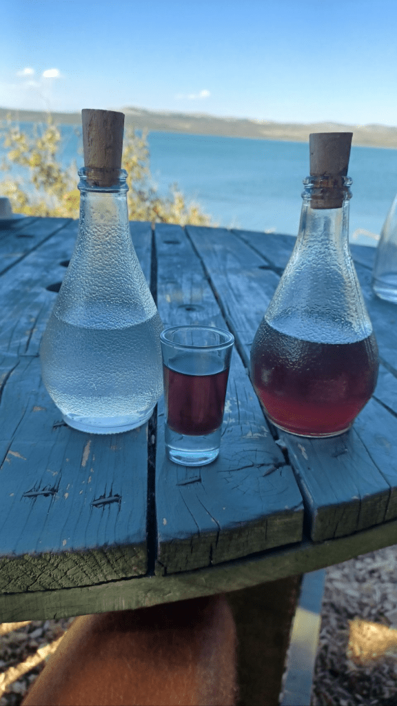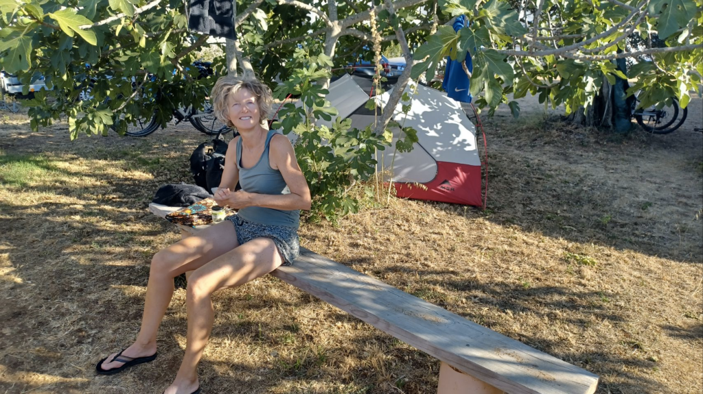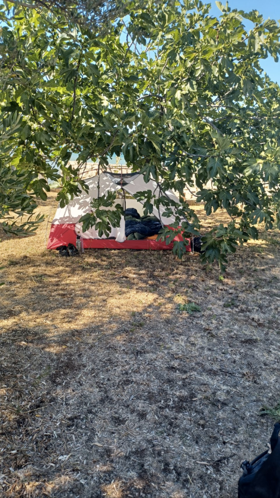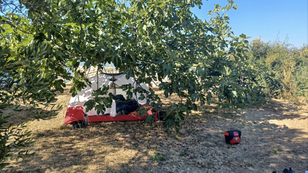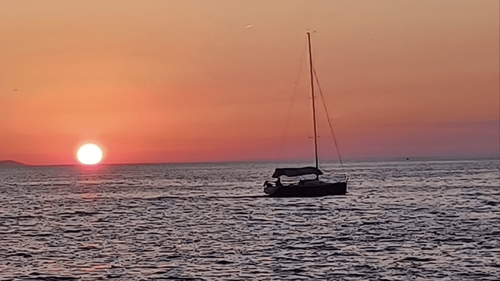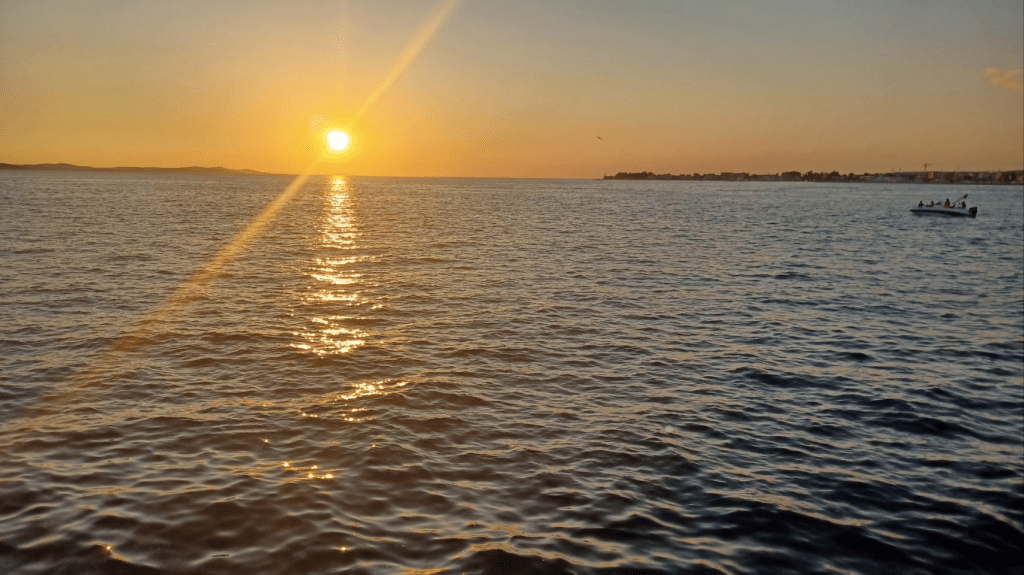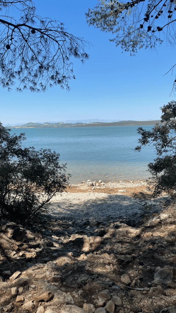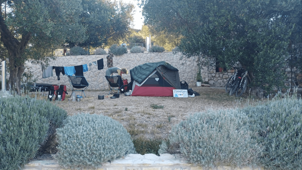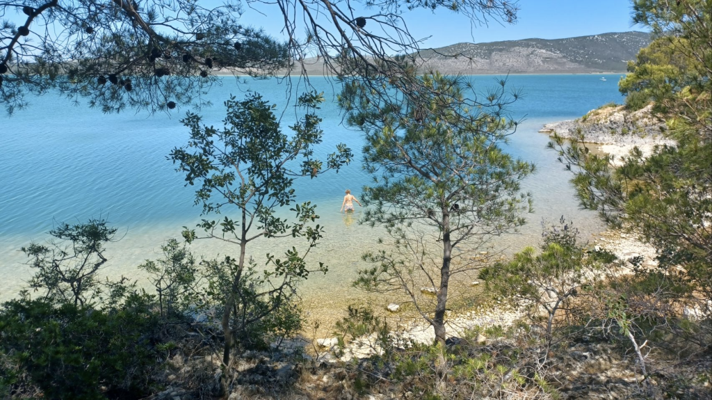Langer blijven op deze superdure camping is geen optie. We gaan richting Biograd, naar een camping die leuk lijkt en is aangeraden door, wederom, “onze Zuid-Afrikaanse fietsvrienden”. De tocht start langs de drukke D8 en we weten nu echt zeker, dit vinden we niet leuk. We komen langs een natuurgebied bij het Vrana meer (Vranska jezero), het grootste meer van Kroatië. We volgen de Eurovelo8, rijden een stuk onverhard mountainbike pad en komen bij een prachtige plek aan het meer. Lekker in de schaduw lunchen, dronevliegen – want die hebben we niet voor niets bij ons, en gebruiken we veel te weinig😏 – en Irma gaat ff zwemmen. Snel daarna zien we een bord staan; “Sie haben Ihre Ziel erreicht”, nou dat willen we wel eens zien. Het blijkt een hele gave plek aan het meer, waar je kan kamperen en lekker eten. Ze gebruiken voornamelijk eigen verbouwd eten, er is dus geen bier en we drinken witte wijn met bubbeltjes water 😏. Toch lekker als het warm is en je dorst hebt. ’s Avonds eten we een drie gangenmenu ( niet vegan 😬) – tonijn (enorm stuk) en gambas (eigenlijk garnalen maar wel veel). Schnapps staat ook op tafel, en Sijtse geeft aan dat voldoende Schnapps goed is voor de spijsvertering. Later schuift Alex die aan de Chiemsee woont aan, drinkt Schnapps met ons mee en we hebben leuke gesprekken met elkaar. Als we naar onze tent lopen is het pikkedonker en muisstil…..heerlijk. We horen ineens in de verte huilende geluiden. Zouden het wolven zijn? We blijven in totaal 4 nachten op deze heerlijke relaxte camping. We drinken koffie in het dorp Drage, een andere dag fietsen we naar Biograd. We doen vooral rustig aan, lezen veel en kletsen met Jens – de voltijds vrijwillige beheerder en onze buurtjes Lex, Renate en hun zoons Justin en Skyler.
