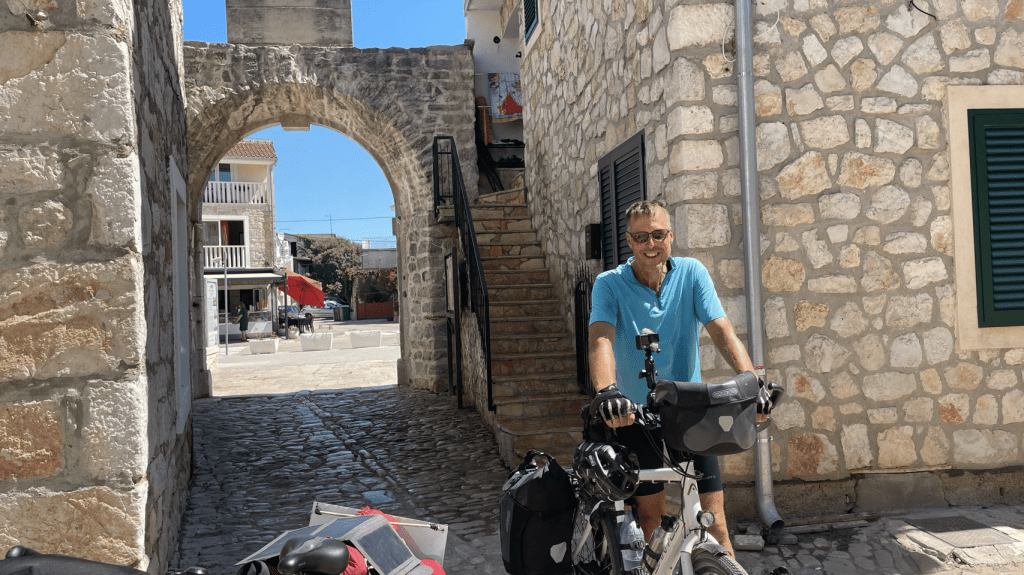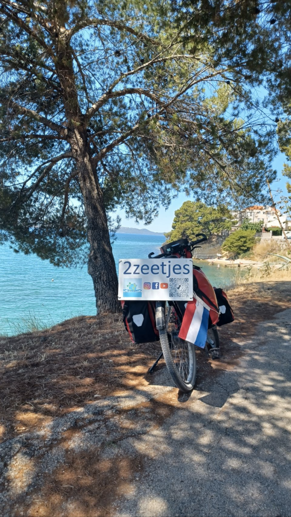 Hoe gaan we verder in de komende dagen? Dat houdt ons best wel bezig. We hebben met onze kinderen afgesproken om een week te kamperen in de buurt van Bolzano (Noord Italië) vanaf 24 juli. De hele Balkan kust route tot Triest fietsen en dan door naar Bolzano is echt te ver. Daarnaast wordt het de komende dagen nog een stuk warmer tot wel 37°C waardoor het fietsen extra zwaar wordt. We hebben besloten om vrijdag 22 juli de veerboot te nemen van Zadar naar Ancona (Italië) en dan de dag erna (zaterdag) met de trein naar Bolzano te gaan. Dat worden lange tochten, de boot- en treinreis duren ongeveer 7 uur. Voor de treinreis moeten we regionale treinen gebruiken, zodat de fietsen mee kunnen. Nu hebben we duidelijkheid over onze planning en dat geeft rust in het hoofd en gelegenheid om de komende week leuke plekken te bezoeken, rustig aan te doen en heerlijk te relaxen. Het idee is om nog naar een stuk of 3 – 4 campings te gaan in de buurt van Biograd en Zadar. We besluiten terug te gaan naar de kust en de Balkan route niet verder te volgen – die gaat namelijk verder naar het noorden over rustige wegen, met nauwelijks campings. We rijden via Šibernik terug naar de kust op weg naar Tisno. Daar is een eiland en schiereiland en op de kaart ziet dat er leuk uit met veel campings. Op advies van “onze Zuid Afrikaanse fietsvrienden” gaan we koffie drinken op het schattige eilandje van Tribunj, wat inderdaad ontzettend leuk is. Aangekomen bij Tisno, wordt bevestigd wat we al weten, de Kroatische kust is druk en heeft veel grote campings. We rijden een stukje door en komen bij de Olivia Green Camping. Bij het inchecken schrikken we ons “de rambam” – €65 voor één nacht op de camping – maar dan krijgen we er wel een armbandje bij 😆, om voor onze drankjes te kunnen betalen bij de poolbar. Nou ja, in deze hitte hebben we geen zin om verder te zoeken naar een camping die wel bij ons past. We genieten van het comfort op de camping, nemen een heerlijk biertje bij het zwembad, zwemmen en zonnen op het strand en gaan eten in Tisno. Uiteindelijk een heerlijke dag. Natuurlijk maken we samen grappen over alles wat anders of beter kan voor €65 per nacht 😁.