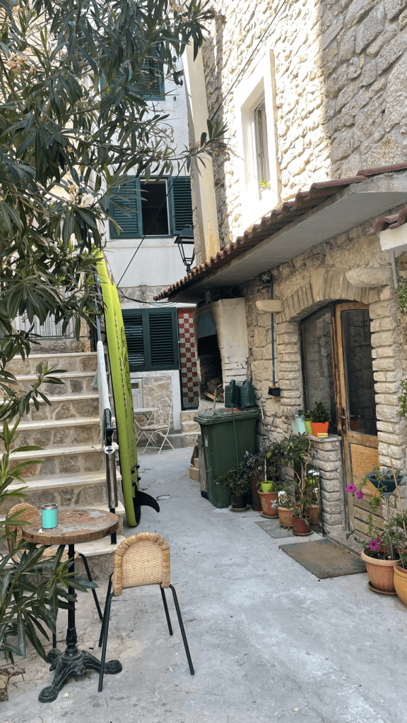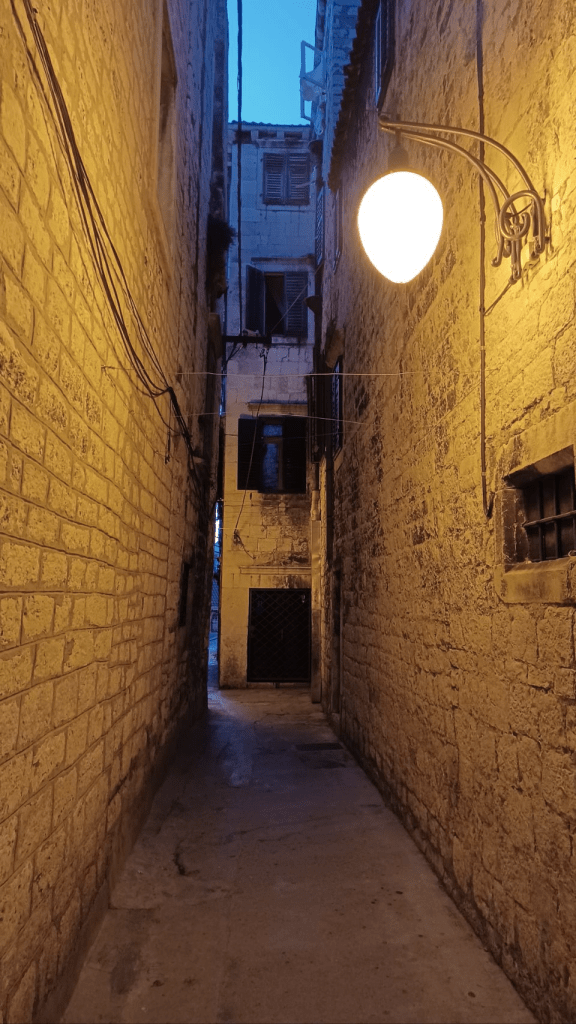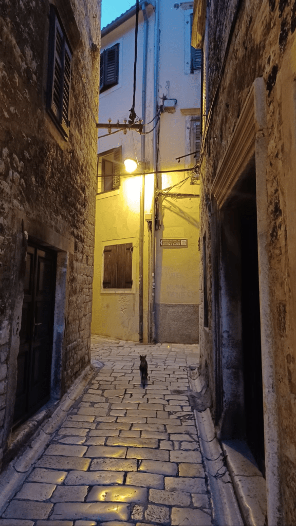 Om naar Šibernik te gaan moeten we een pas over van 520m. Mooie weg met een aantal haarspeldbochten. Uiteindelijk was het goed te doen, met mooi uitzicht op de baai van Split. Daarna afdalen en door een grote vallei richting Šibernik. Warm en rustig zijn waarschijnlijk de beste samenvatting. In Šibernik hebben we een tweepersoonskamer geboekt in een heel leuk hostel. s’Avonds eten we heerlijk in de oude stad. Sijtse eet lamsrack, en dat is niet echt veganistisch😬, maar hij had er zo’n zin in en het smaakte zó goed…..Trouwens wat een ontzettend leuk stadje is Šibernik, veel kleine steegjes, trappen, oude Venetiaanse huizen een boulevard, echt heel gezellig. Na het eten hebben we lekker door de stad gestruind en de avond afgesloten met een biertje met life muziek. We hoopten een dag langer te kunnen blijven, maar het hostel was helemaal volgeboekt, dus we konden niet bijboeken en gaan de volgende dag verder.