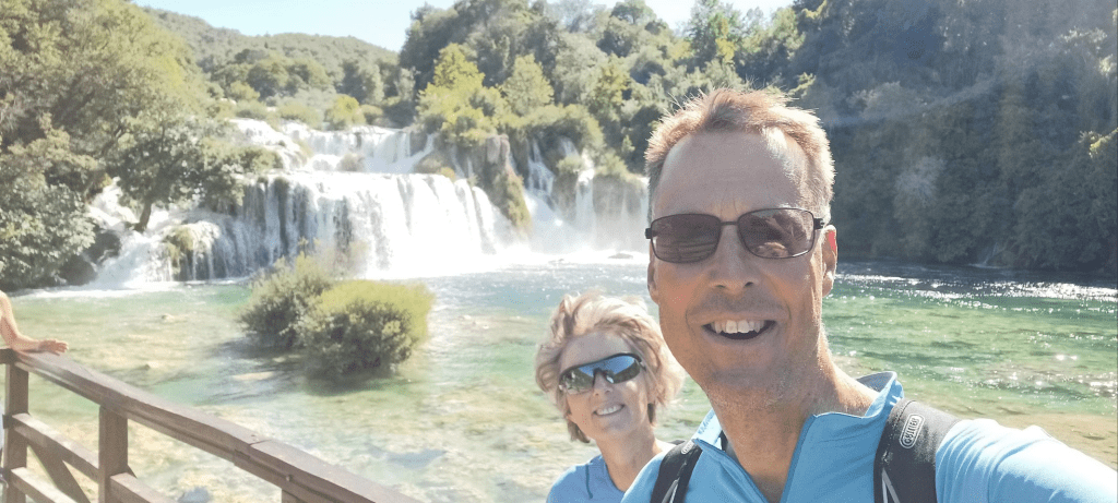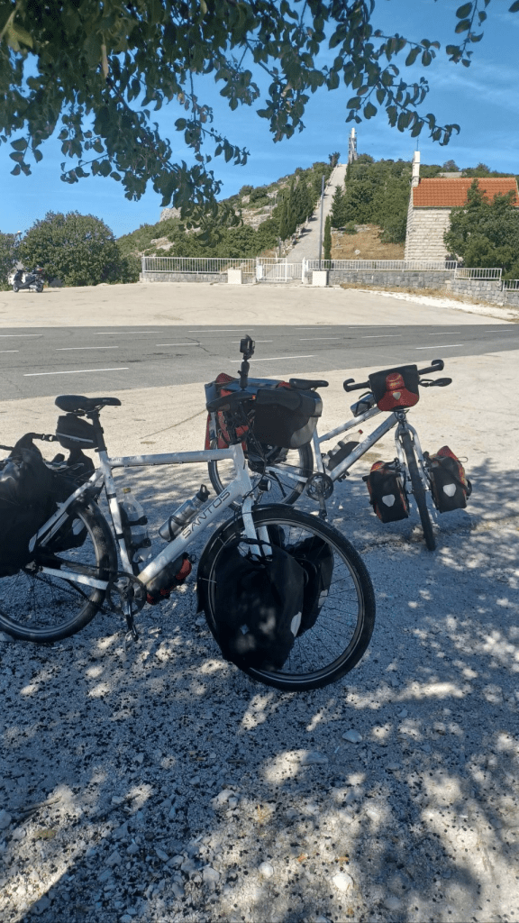 Rustig ontbeten in de buitentuin/op het terras van het hostel, heel relaxed. En uitgebreid gekeken waar we naar toe zouden gaan. Besloten om de route te vervolgen noord-oost richting Losovac. Steil de stad uit, ai, dat waren we ff vergeten. En het landschap is vergelijkbaar met de dag ervoor: bergachtig, maar met lage begroeing. We stoppen bij Camping Marina in Losovac, niet ver voor Skradin. Relaxte camping met zwembad, schaduw onder pijnbomen en een barretje met beperkte kaart. Dus we moeten weer 3 km terug voor een supermarkt. Volgende dag een rustdag gehouden, nauwelijks iets gedaan 😏. De dag erna hebben we het Nationale park Krka bezocht. Daar zijn hele mooie watervallen en een prachtige natuur. Op de camping hebben we ook 3 fietsers uit Zuid-Afrika ontmoet, Carl, Michael en Nicholas Lambrecht. Echte fietshelden zijn het. Michael is gestart in Barcelona, Nicolas kwam erbij in Milaan en hun vader fietst 2 weken mee vanaf Zadar naar Dubrovnik. Avonturiers! Nicolas gaat volgend jaar zijn master studie doen in Delft. Wat toevallig 😀