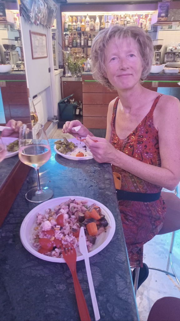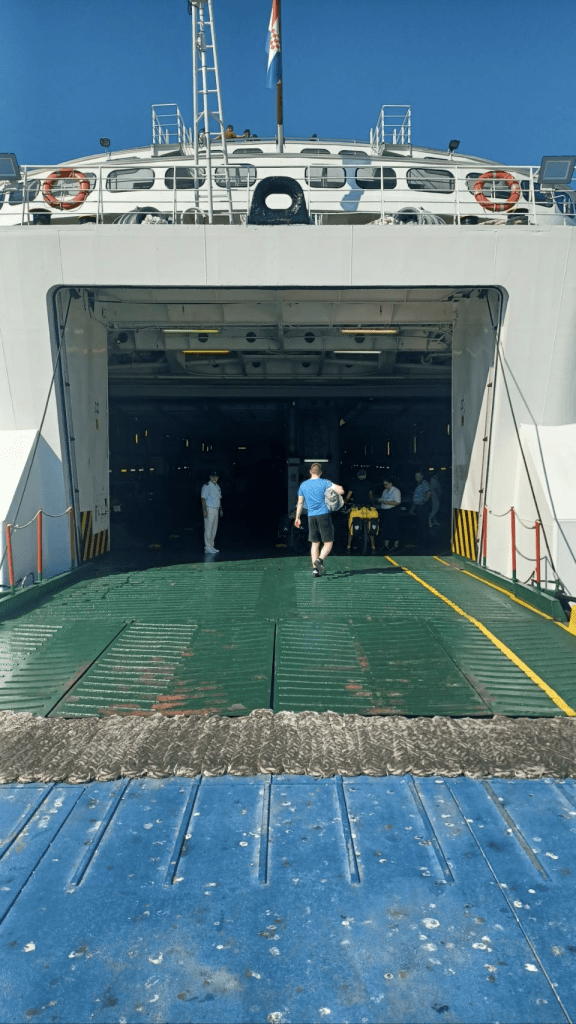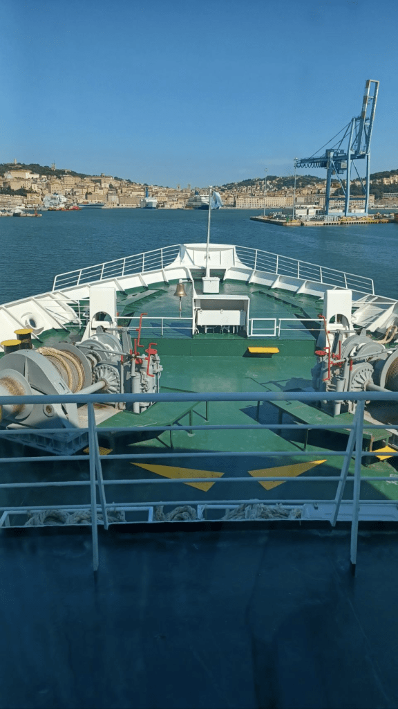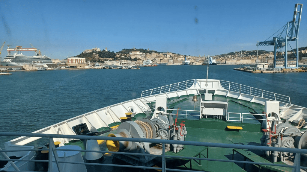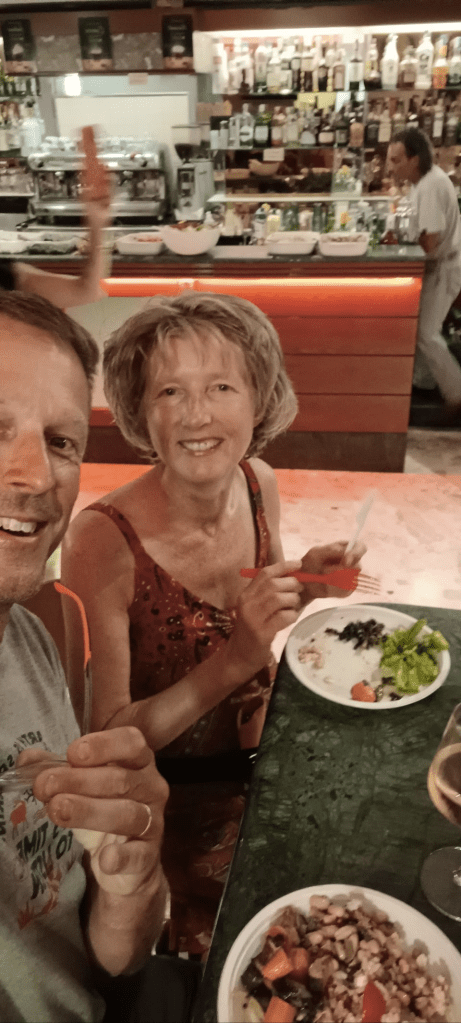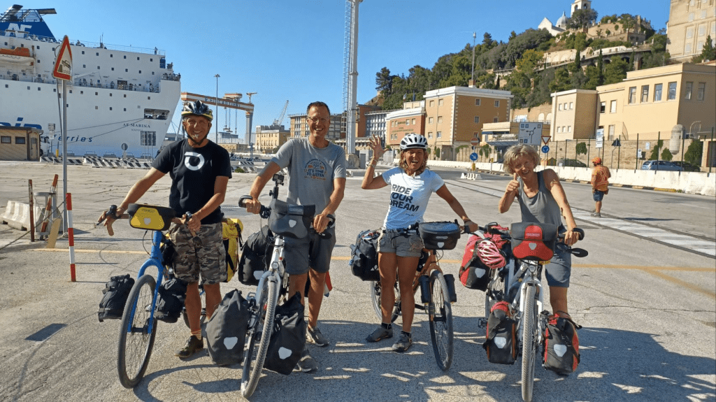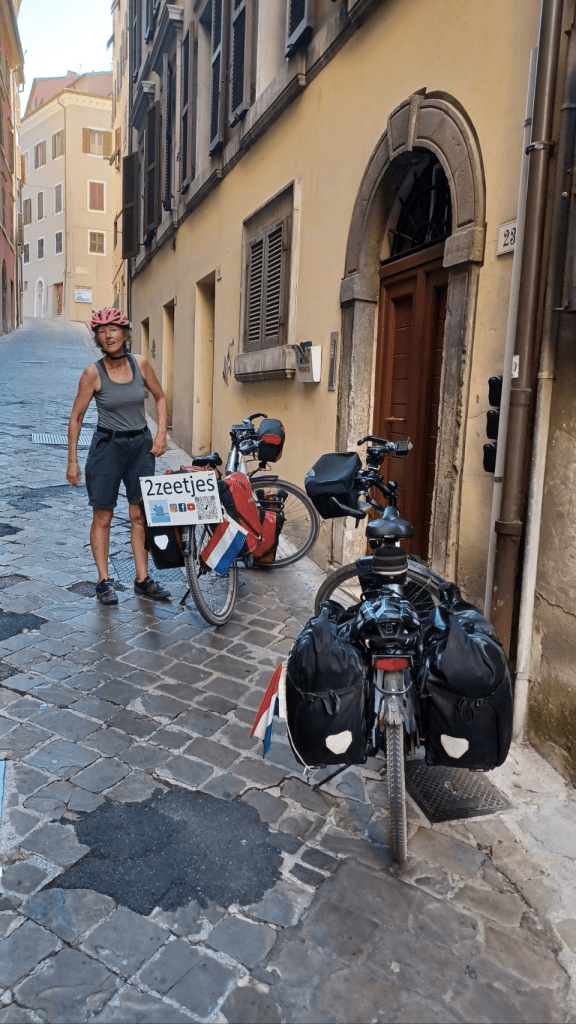 Op weg naar Noord Italië nemen we de veerboot van Zadar naar Ancona. Gelukkig hebben we gisteravond nagevraagd waar vandaan de veerboot gaat, want op Google Maps en OsmAnd staat dat de veerboot vanaf het schiereiland – de oude stad eigenlijk gaat, maar blijkt niet te kloppen. Het vertrekt op de plek waar we gisteren zijn aangekomen, zo’n 3km vanaf ons hotel. We gaan vroeg weg, zodat we bij de boot kunnen ontbijten, de gereserveerd tickets op kunnen halen en een stoel naast elkaar kunnen regelen. Bij de veerboot komen we nog meer fietsers tegen: Valter en zijn vrouw Adriana , erg gezellige fietsende Italianen uit Turijn. We kletsen wat en delen ervaringen. Dan 7 uur op de boot, we zien in de verte dolfijnen, Irma doet een tukkie en Sijtse werkt aan een film over het eerste deel van onze reis. Die zit er eigenlijk nu op. We zijn op weg naar Noord Italië waar we onze kinderen (eindelijk) weer gaan zien😀😀😀. De zeereis gaat voorspoedig, het appartement is lekker dichtbij en erg gezellig. Wel is het vierhoog en moeten de fietsen omhoog gedragen worden. Na een biertje op een terras, zoeken we een restaurantje om wat te eten. Ancona leek leuk, waarschijnlijk hebben we maar een klein stukje gezien, maar er zijn weinig leuke restaurants in de buurt waar we zijn. Iets achteraf vinden een lokale bar, bomvol met locals die gezellig eten en drinken. Bij navraag (in het Frans) blijkt het eten gratis als je je drankje koopt (wel wat duurder dan normaal maar je krijgt ook waar voor je geld). Wat een mooi concept. Dus we doen gezellig mee, erg lekker gegeten, ook nog zonder vlees 😁! En ons prima vermaakt met op de achtergrond Italiaanse karaoke….