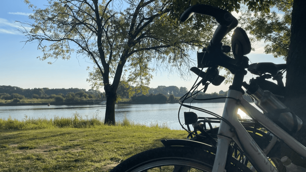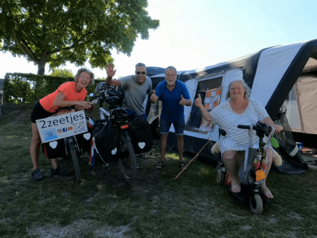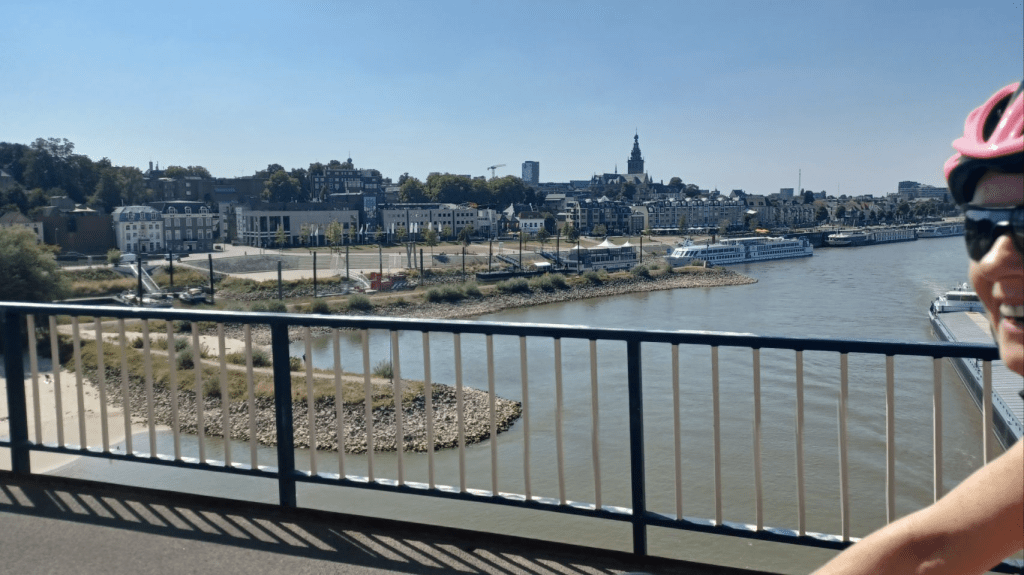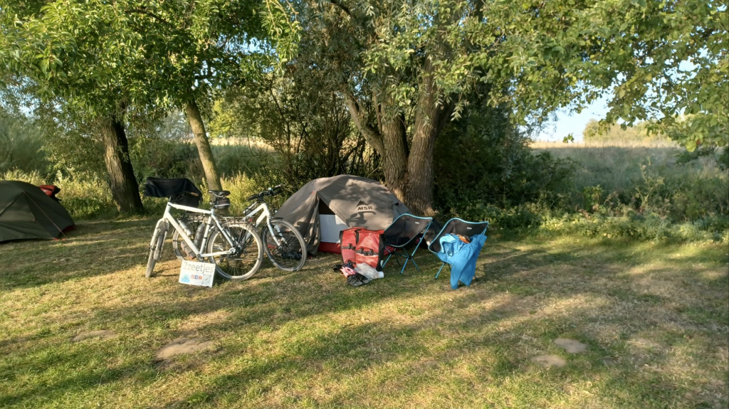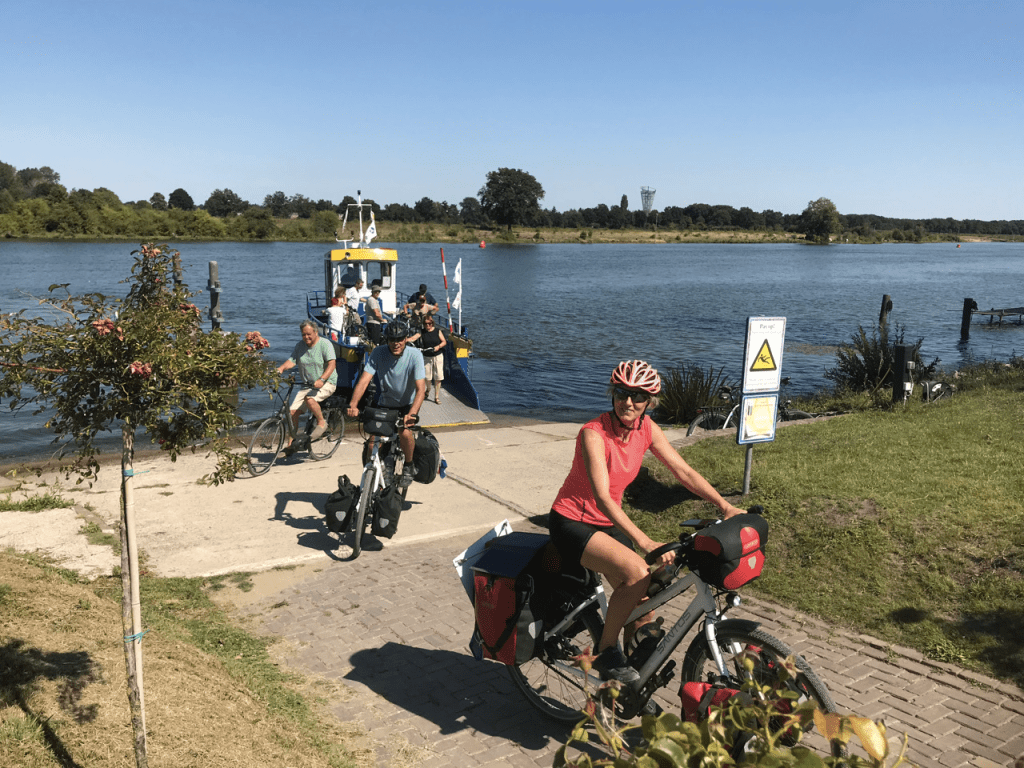 Weer een warme dag voor de boeg. We hebben afgesproken met Sijtse’s ouders bij een restaurantje in Afferden voor een “uitzwaailunch”, dat is dan het voordeel als je nog ff in Nederland fietst 🤗. Na koffie, wafels en lunch gaan we verder naar Blitterswijck waar Sheila (een nicht van Irma) en haar man Jeroen op een camping langs de Maas staan. Via een kort stukje in Duitsland – toch leuk – en een fietsveer komen we in de loop van de middag aan. Erg gezellig om Sheila en Jeroen weer te zien. Lekker bijkletsen en pizza eten. Top!!!