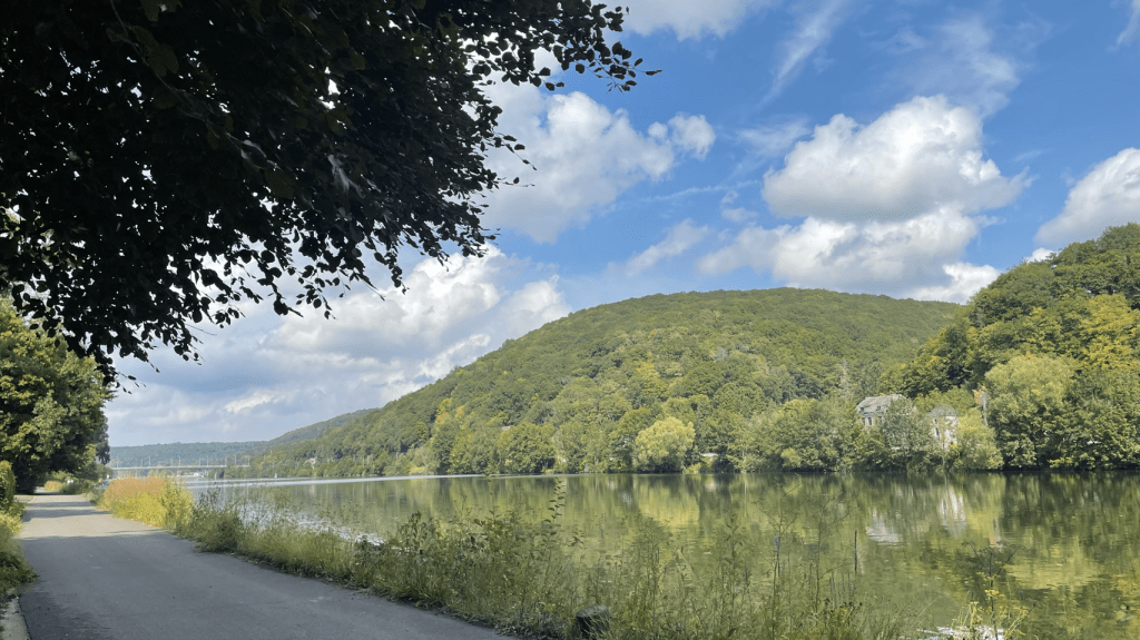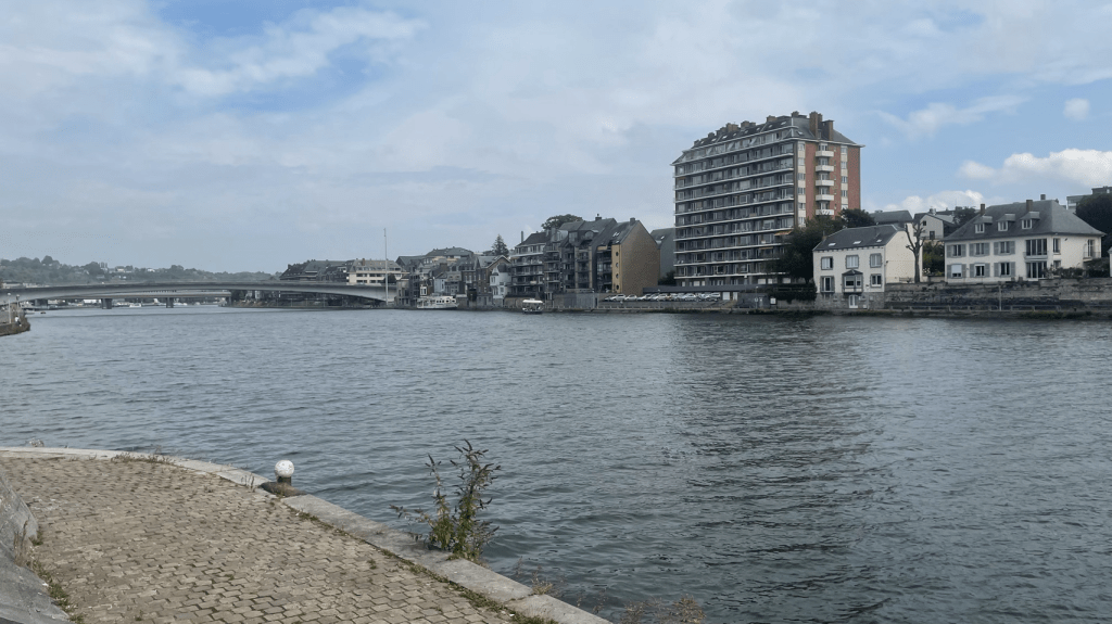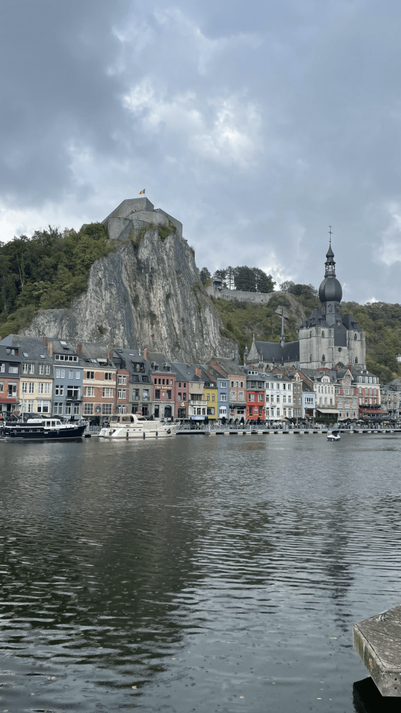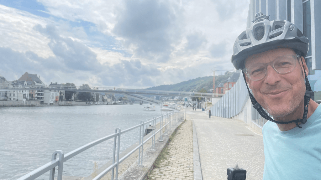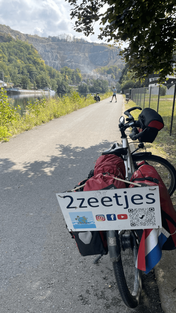 Voor vandaag is er regen beloofd en dat klopt; bij het opstaan druppelt het al licht. Dus snel inpakken en ontbijten op het droge terras. Bij vertrek trekken we vast de regenpakken aan en dat blijkt geen overbodige luxe. Al gauw komt het met bakken uit de lucht maar we peddelen rustig verder over de groene Ravel baan richting Dinant. Dat is globaal het doel voor vandaag. Zodra het wat opklaart trekken we onze pakken uit om te laten drogen, zonder fietst nu eenmaal fijner, maar het is toch een paar keer een verkleedpartij. Kopje koffie gedronken in een sportcafé en lunch op een bankje langs de route… maar wel in de zon ☀️! Bij Namen verlaten we de Ravel (rustige fietsroutes over voormalige treinbanen en jaagpaden) en fietsen langs de Maas. Het water staat hoog ondanks de droogte, dankzij de vele dammen en sluizen. Mooie en ook chique omgeving. Geen vrachtvaart. Vlak voor Dinant begint nog ff een bui, maar we halen nog wel een ijsje vooral voor de energie. Snel boodschappen en door gereden naar de camping 2.5 km verderop aan het riviertje de Lesse tussen de bergen. Wat is het hier mooi! Op de camping hebben we gelijk weer aanspraak. Heel gezellig 😁. Onder andere van Jan die ook op weg is naar Zuid Spanje. Populaire bestemming 😄.