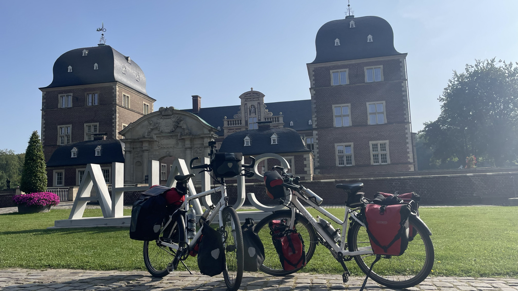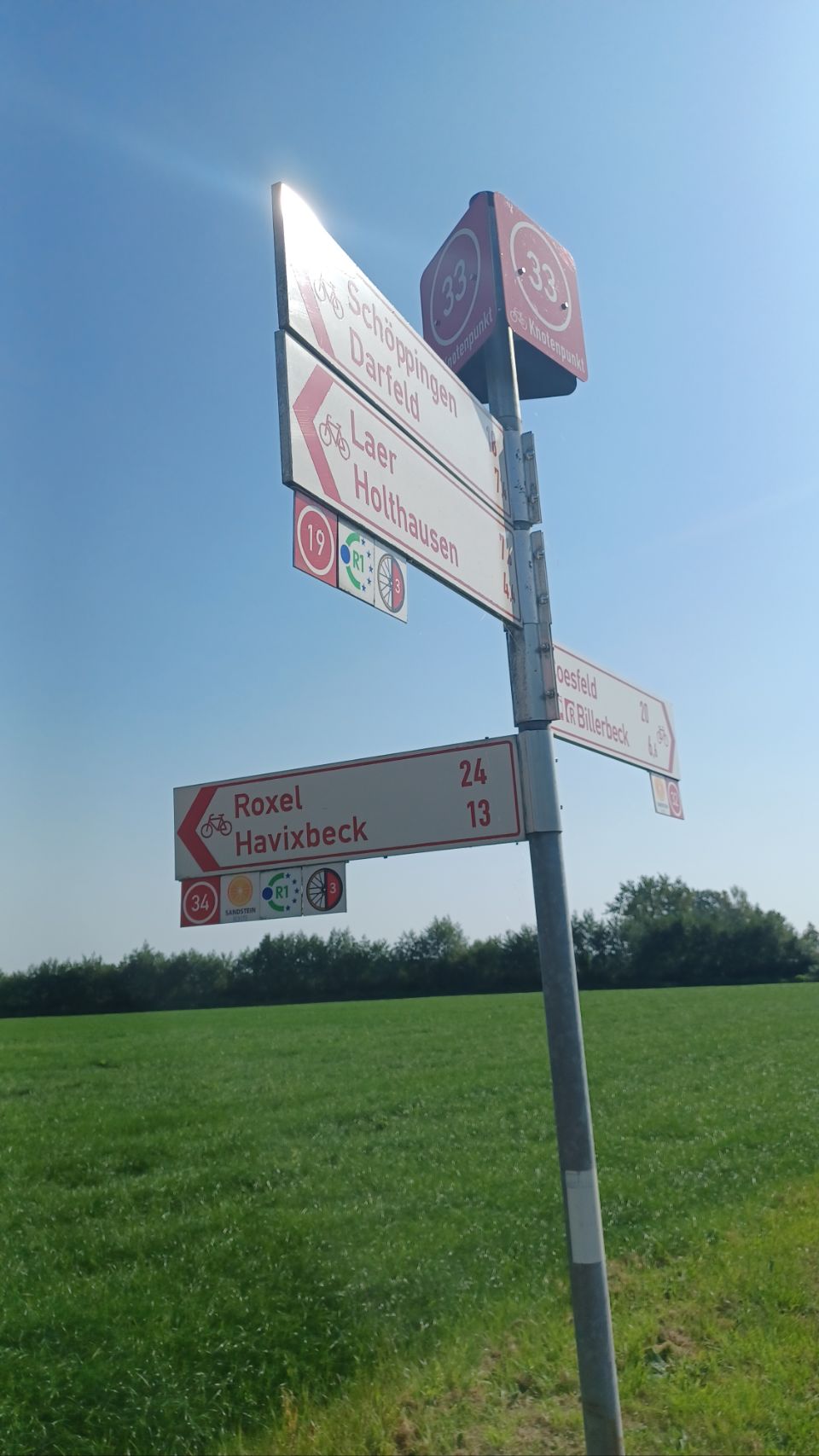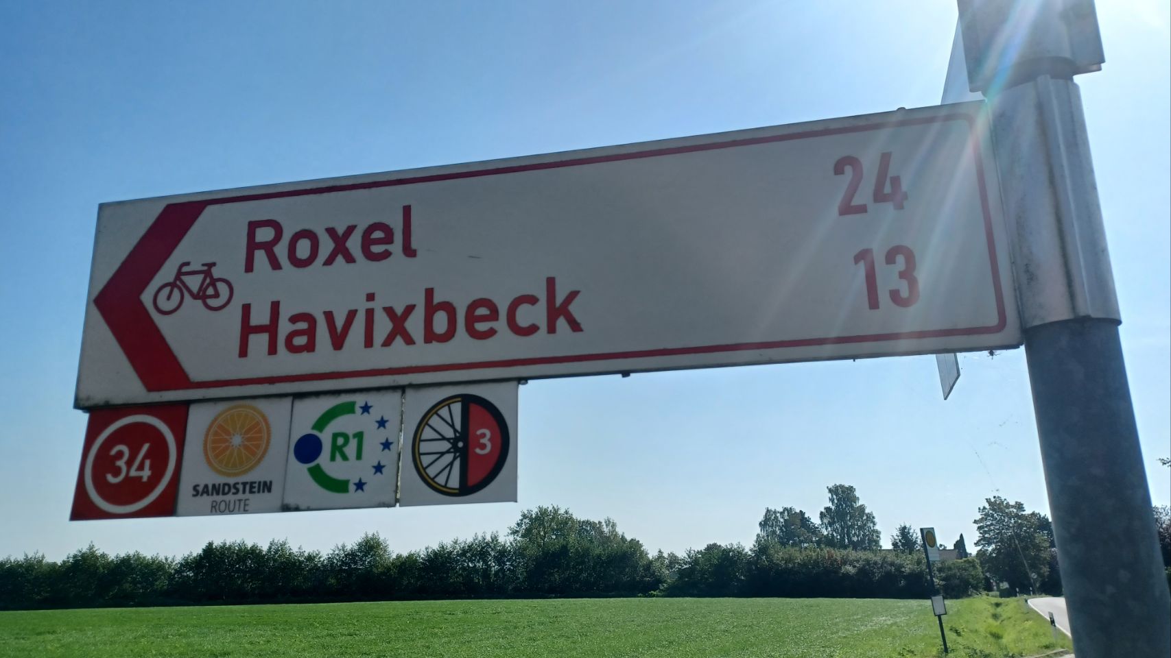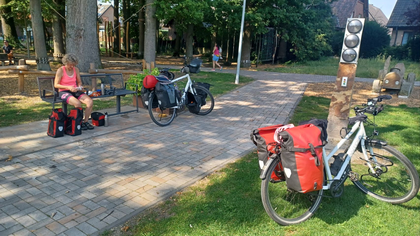 In 2021 hebben we vanaf Münster de radweg R1 gefietst naar de Pools-Duitse grens. Toen zijn we met de trein naar Münster gegaan, voor een mooie fietstour van 3 weken via o.a. Berlijn. Vandaag zijn we fietsend aangekomen in Münster, dus is het een leuke aanvulling op onze eerdere reis. Morgen gaan we met de trein naar Karlsruhe. Tja, en vandaag… fietsen door het westen van Duitsland, het platte is er af en het vriest ook niet meer 😉 – het was vandaag ruim 30 graden. De tent staat op een speciaal tentenveldje en we eten in het restaurant op de camping. We zijn weer helemaal tevreden 😀👍🏕☀️