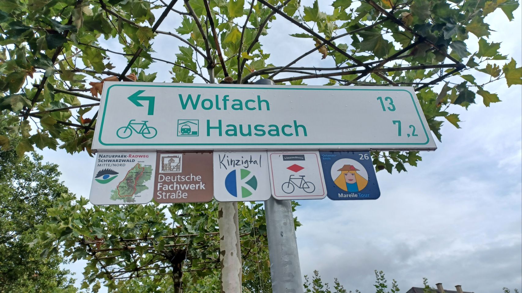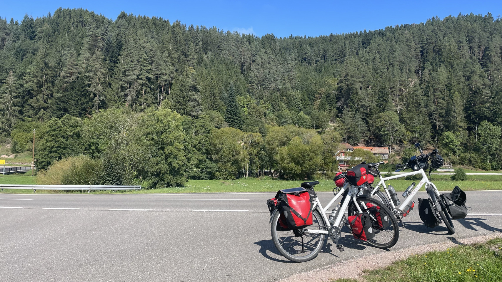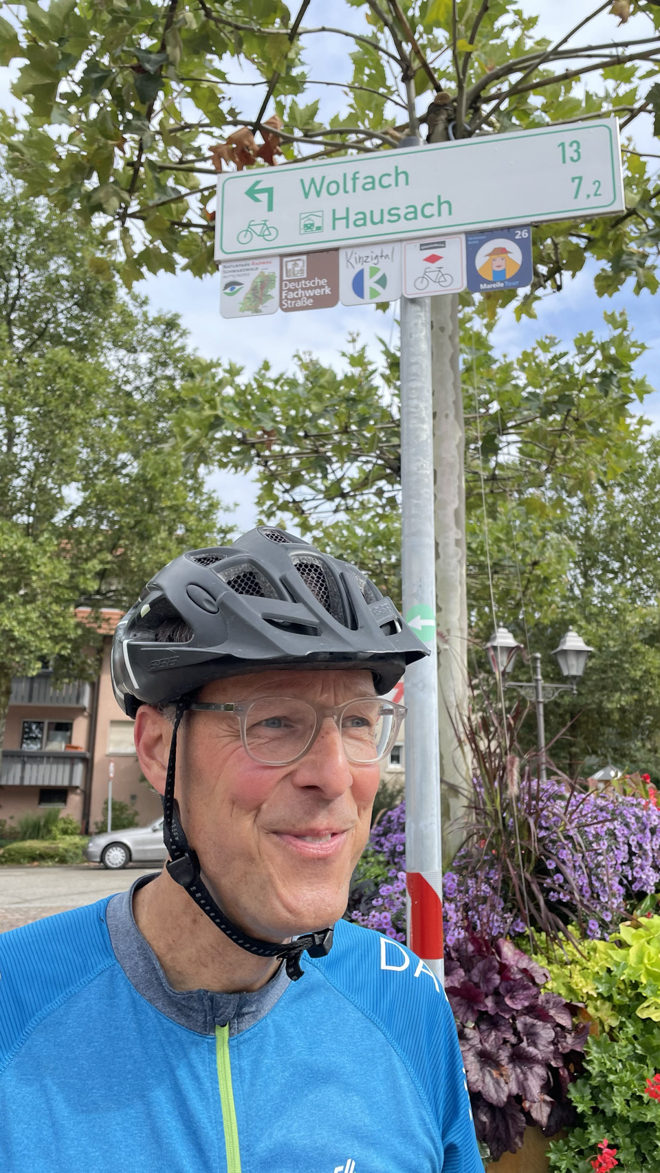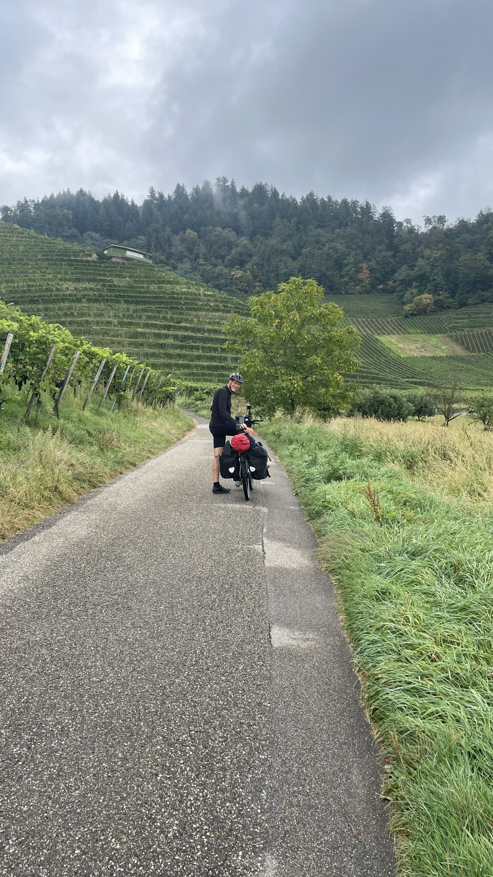 In de verte rijzen de bergen van het Zwarte Woud, gehuld in nevel. Het regent als we opstaan en, volgens de voorspellingen, zal het de hele dag regelmatig regenen. Dat Woud gaat zich van z’n Zwartste kant aan ons laten zien, lijkt het. Als het eenmaal niet meer regent, pakken we alles snel in, maar duurt het uiteindelijk wat langer voordat we weg zijn. We komen door Offenburg en moeten 😆 dan wel een Schwarzwalder Kirschtorte 🍰🍰 eten. Daarna komen we echt tussen de bergen, en wat blijkt: het is hier lieflijk, bijna kneuterig, gezellig en er zijn allerlei prachtige schattige stadjes met oude vakwerkhuizen. Niks zwart grauw of mistiek. Eerst eindigen de dorpen op bach (Ohlsbach, Gengenbach, Dantersbach), maar daarna verdwijnt de “b”. Nu heten de plaatsen Biberach, Steinach, Haslach, Hausach en Wolfach. Allemaal even leuk, maar waarom zonder “b” en schijnbaar niet verwijzend naar die beek (waarschijnlijk de Kinzig). Na 67km komen we op een leuke camping met een venijnige bergopwaarts finale. Morgen trekken we verder in het magische woud 😉.