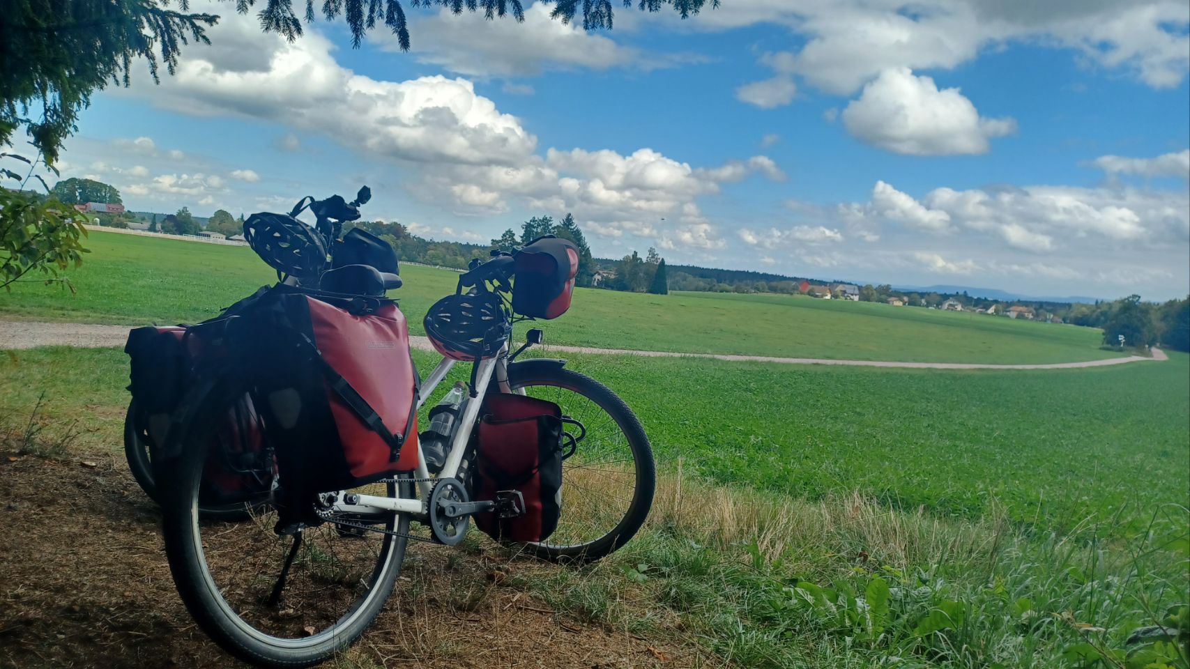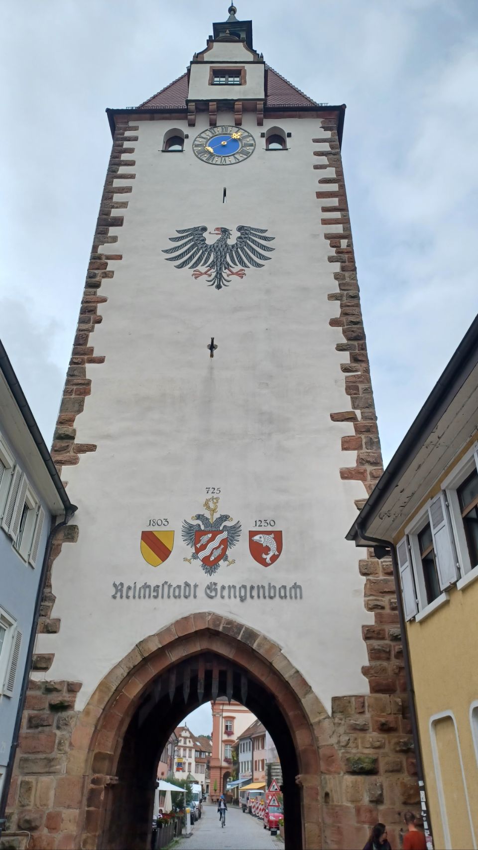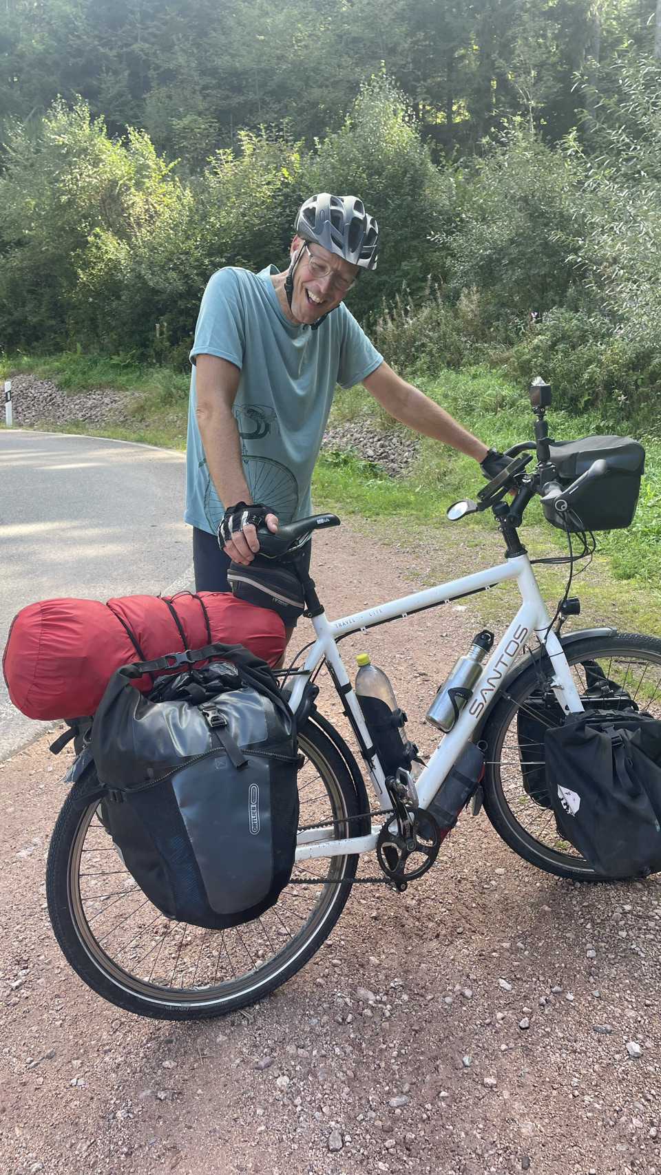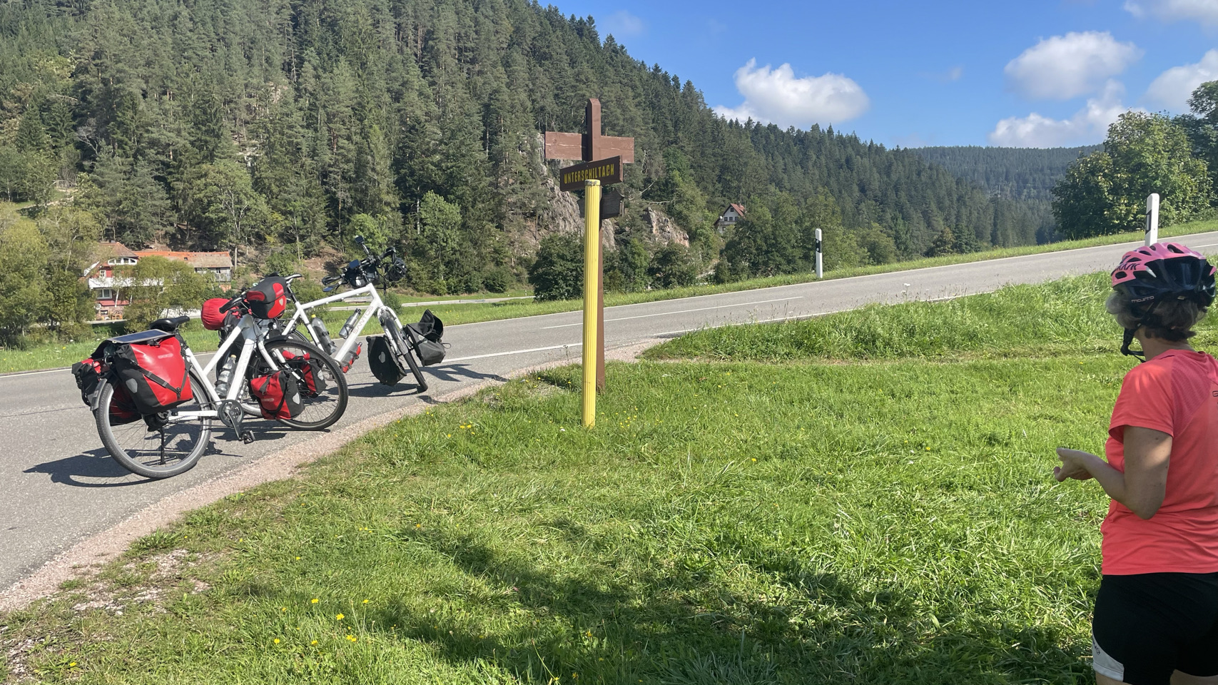 In de verte rijzen de bergen van het Zwarte Woud, gehuld in nevel. Het regent als we opstaan en, volgens de voorspellingen, zal het de hele dag regelmatig regenen. Dat Woud gaat zich van z’n Zwartste kant aan ons laten zien, lijkt het. Als het eenmaal niet meer regent, pakken we alles snel in, maar duurt het uiteindelijk wat langer voordat we weg zijn. We komen door Offenburg en moeten 😆 dan wel een Schwarzwalder Kirschtorte 🍰🍰 eten. Daarna komen we echt tussen de bergen, en wat blijkt: het is hier lieflijk, bijna kneuterig, gezellig en er zijn allerlei prachtige schattige stadjes met oude vakwerkhuizen. Niks zwart grauw of mistiek. Eerst eindigen de dorpen op bach (Ohlsbach, Gengenbach, Dantersbach), maar daarna verdwijnt de “b”. Nu heten de plaatsen Biberach, Steinach, Haslach, Hausach en Wolfach. Allemaal even leuk, maar waarom zonder “b” en schijnbaar niet verwijzend naar die beek (waarschijnlijk de Kinzig). Na 67km komen we op een leuke camping met een venijnige bergopwaarts finale. Morgen trekken we verder in het magische woud 😉.