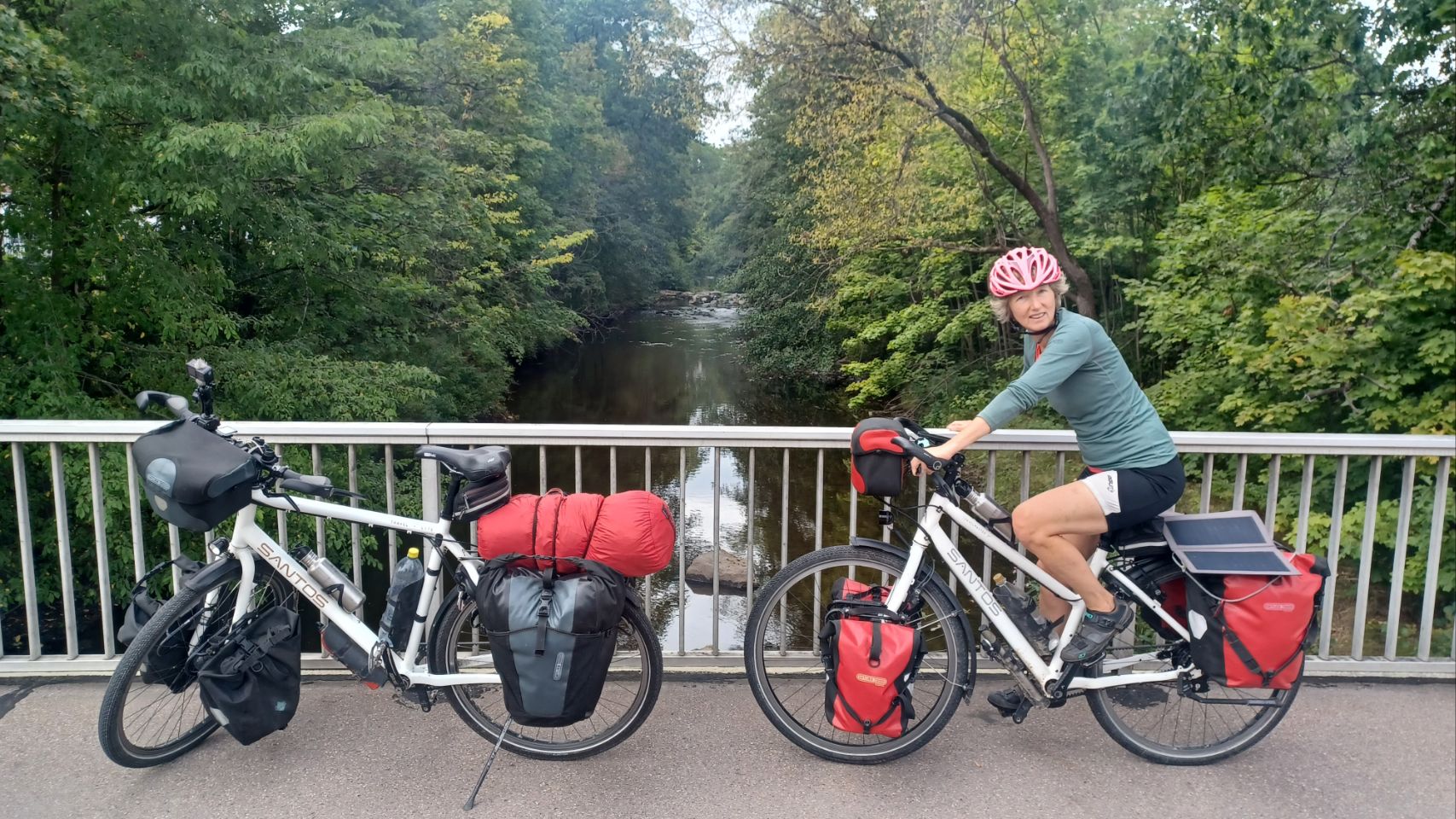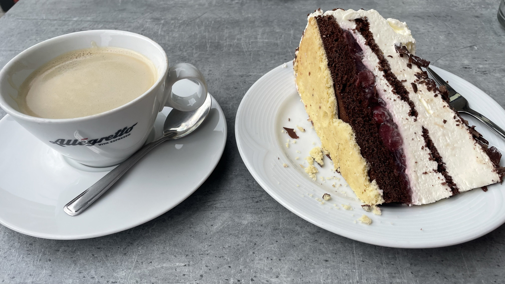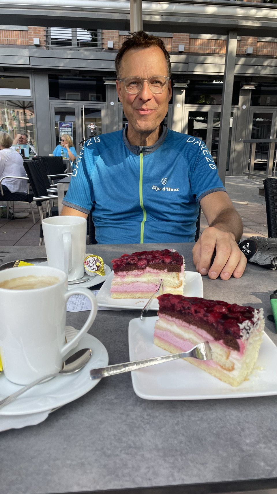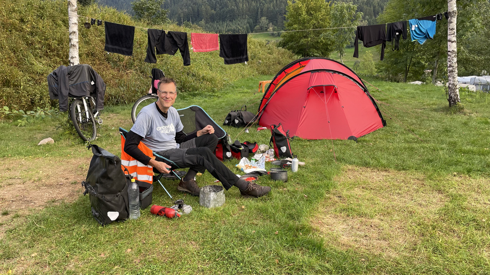 In de verte rijzen de bergen van het Zwarte Woud, gehuld in nevel. Het regent als we opstaan en, volgens de voorspellingen, zal het de hele dag regelmatig regenen. Dat Woud gaat zich van z’n Zwartste kant aan ons laten zien, lijkt het. Als het eenmaal niet meer regent, pakken we alles snel in, maar duurt het uiteindelijk wat langer voordat we weg zijn. We komen door Offenburg en moeten 😆 dan wel een Schwarzwalder Kirschtorte 🍰🍰 eten. Daarna komen we echt tussen de bergen, en wat blijkt: het is hier lieflijk, bijna kneuterig, gezellig en er zijn allerlei prachtige schattige stadjes met oude vakwerkhuizen. Niks zwart grauw of mistiek. Eerst eindigen de dorpen op bach (Ohlsbach, Gengenbach, Dantersbach), maar daarna verdwijnt de “b”. Nu heten de plaatsen Biberach, Steinach, Haslach, Hausach en Wolfach. Allemaal even leuk, maar waarom zonder “b” en schijnbaar niet verwijzend naar die beek (waarschijnlijk de Kinzig). Na 67km komen we op een leuke camping met een venijnige bergopwaarts finale. Morgen trekken we verder in het magische woud 😉.