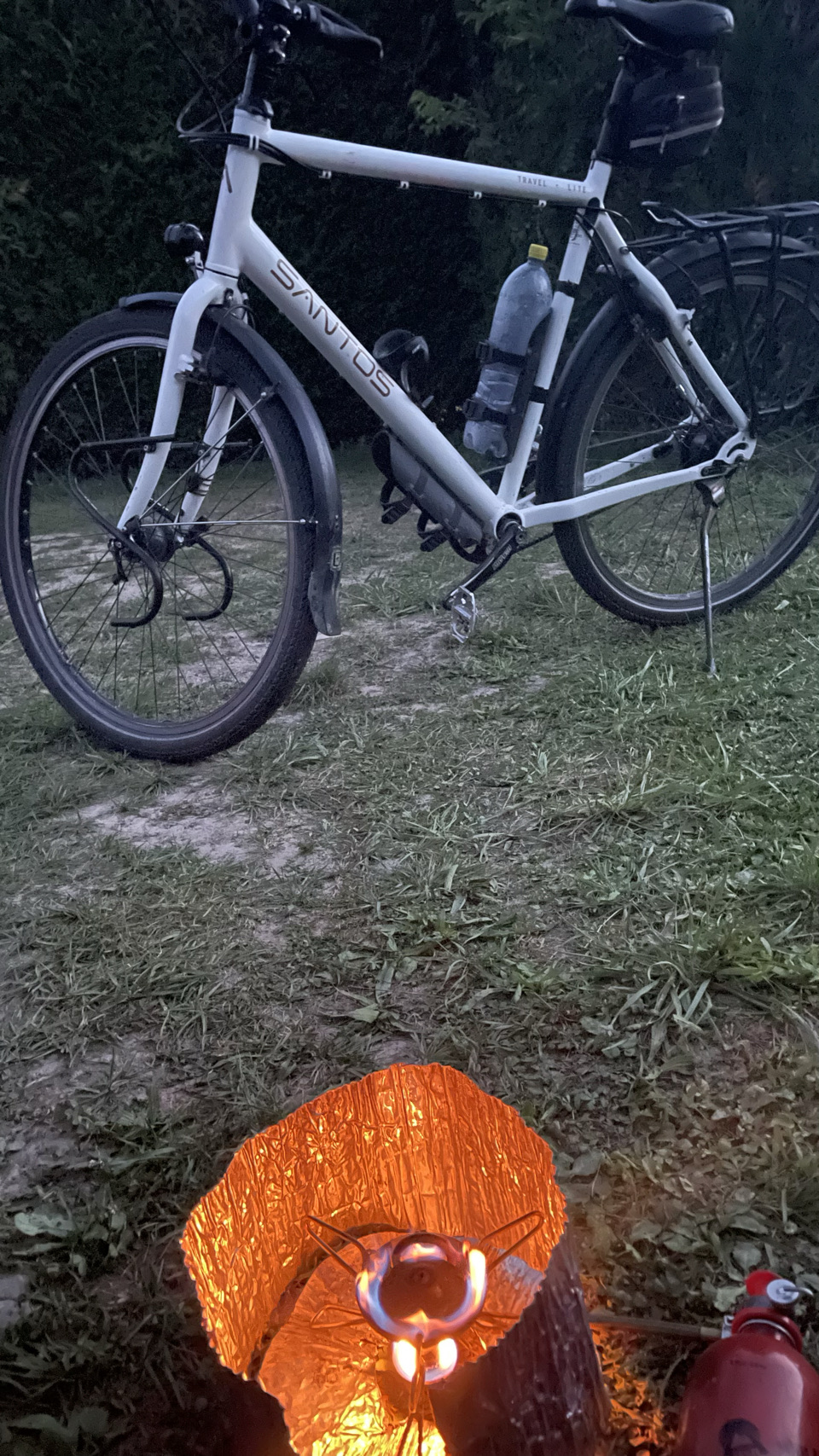 We staan vanochtend om 7 uur op, omdat we om 9 uur de trein naar Karlsruhe nemen. Wat gelijk opvalt; de zon is nog niet boven de bomen (eigenlijk is het nog schemerig) en de tent is ontzettend nat – kletsnat. Ik weet niet hoeveel (kilo)gram water we meezeulen, maar ja, we hebben geen keuze. We fietsen Münster weer in, zijn natuurlijk ruim op tijd op het station, want fietsen meenemen in de trein is altijd wel een dingetje. Gelukkig hebben we dit al vaak gedaan en ook nu gaat het gladjes. Net als de treinreis trouwens. We fietsen vanaf Karlsruhe naar de Rijn, want we willen overnachten in Frankrijk. Extra land aantikken! De Franse sfeer is toch al te zien, Irma wordt er direct weer verliefd op. Als de schemering rond 20 uur inzet, zijn er weer hordes prikvrienden en wordt alles ineens klam. Overdag is het bloedheet en ineens wordt alles vochtig. Snel spullen in de tent, fietstassen dicht en inspuiten met Deet (tegen de muggen). Morgen gaan we richting Straatsburg, dat is niet zo ver (70 km) en vlak, dus hopelijk kan alles morgenochtend drogen in de zon.