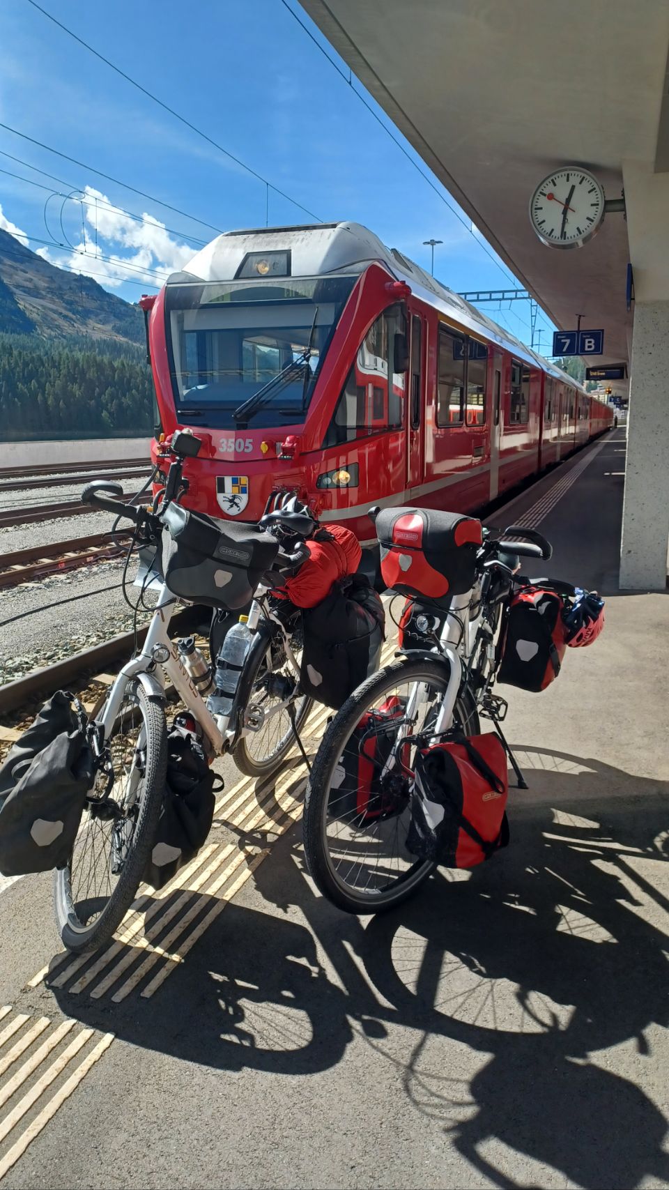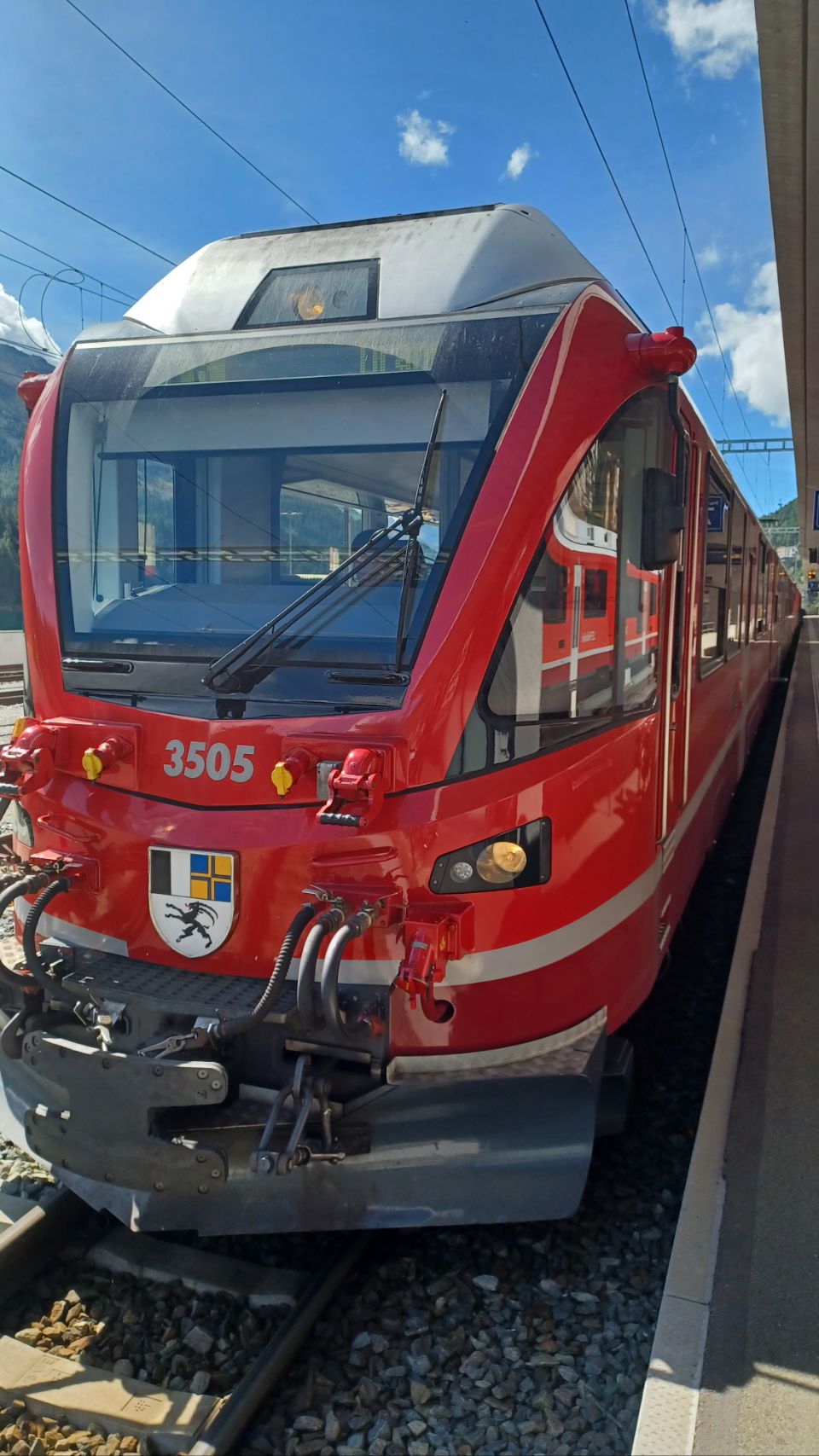 Vandaag gaan we met de trein van de Rhätische Bahn dwars door de Zwitserse Alpen. Een groot deel is het Bernina traject dat op de UNESCO werelderfgoedlijst staat. Vanaf Landquart gaan we gestaag door het prachtige landschap naar het op 1800m hoogte gelegen St. Moritz. Daar stappen we over in de richting van Tirano (Italië). Met vele keerlussen en bruggen gaan we helemaal naar de Berninapas op 2330m. Wat een uitzichten! Na elke bocht zie je weer wat anders. Ook het weer zit enorm mee – blauwe lucht met sporadische witte wolken. De belevenis is echt Rail Away 3D in het kwadraat. We hebben een hotel geboekt in Tirano, omdat er helemaal geen campings in de buurt zijn, maar gelukkig wel veel hele mooie bergen 😀. Morgen gaan we naar het Comomeer.