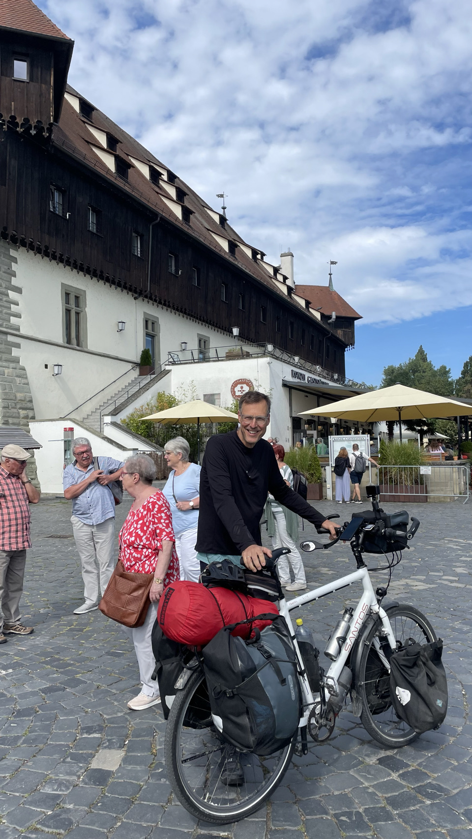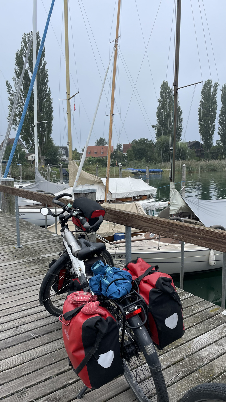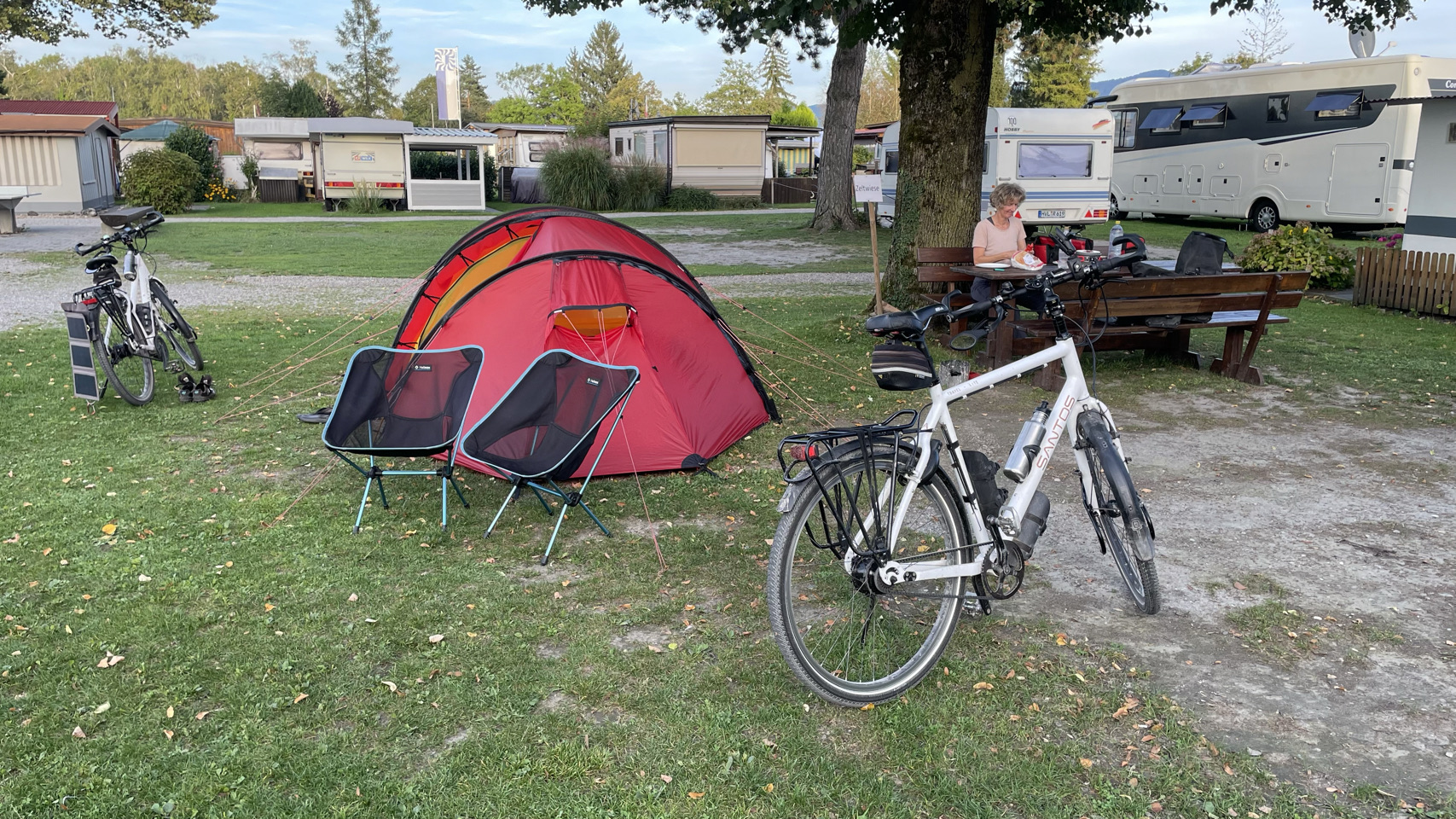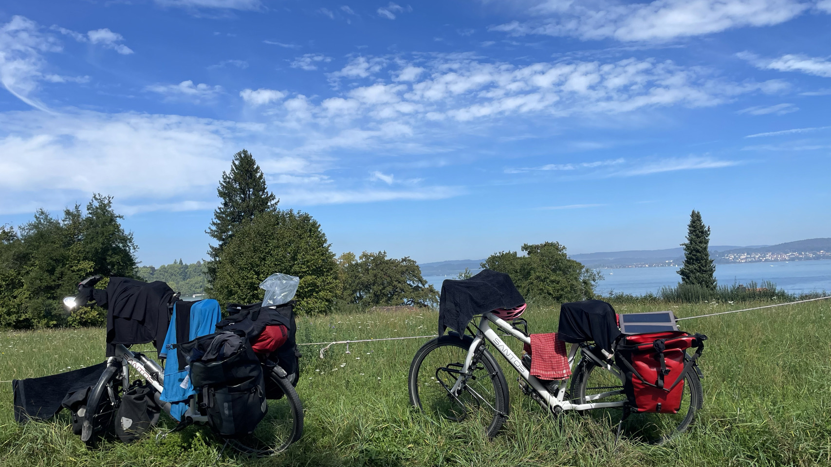 Rondom het water van de Bodensee, als de sfeer zuidelijk wordt, de omgeving nog mooier en de Alpen opdoemen aan de horizon, dan zijn daar ineens kuddes mensen. Ze bevolken de stadjes, boulevards en terrassen en laten zich bij elkaar proppen tussen water en spoor in witte tupperware boxen die ze campers of caravans noemen. We gaan mee in de stroom, via het schiereiland Reichenau en de prachtige stad Kostanz. We fietsen langs de oevers van het meer, maar niet naar Mainau, want de fietsen mogen niet mee én het kost €28 per persoon en zoveel tijd kunnen én willen we daar niet blijven. De veerboot brengt ons van Staad naar Meersburg en iets verder op de camping bij Immenstaad blijkt het volledig vol te zijn. Toch is er op de tentenweide gelukkig nog een plekje voor ons. We eten in Immenstaad en als het donker is gaan we voldaan terug naar de tent. Morgen weer een nieuwe dag…
