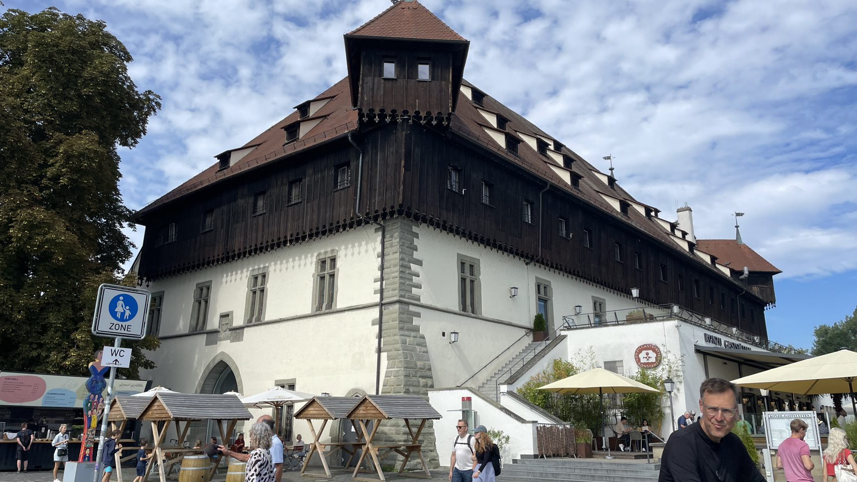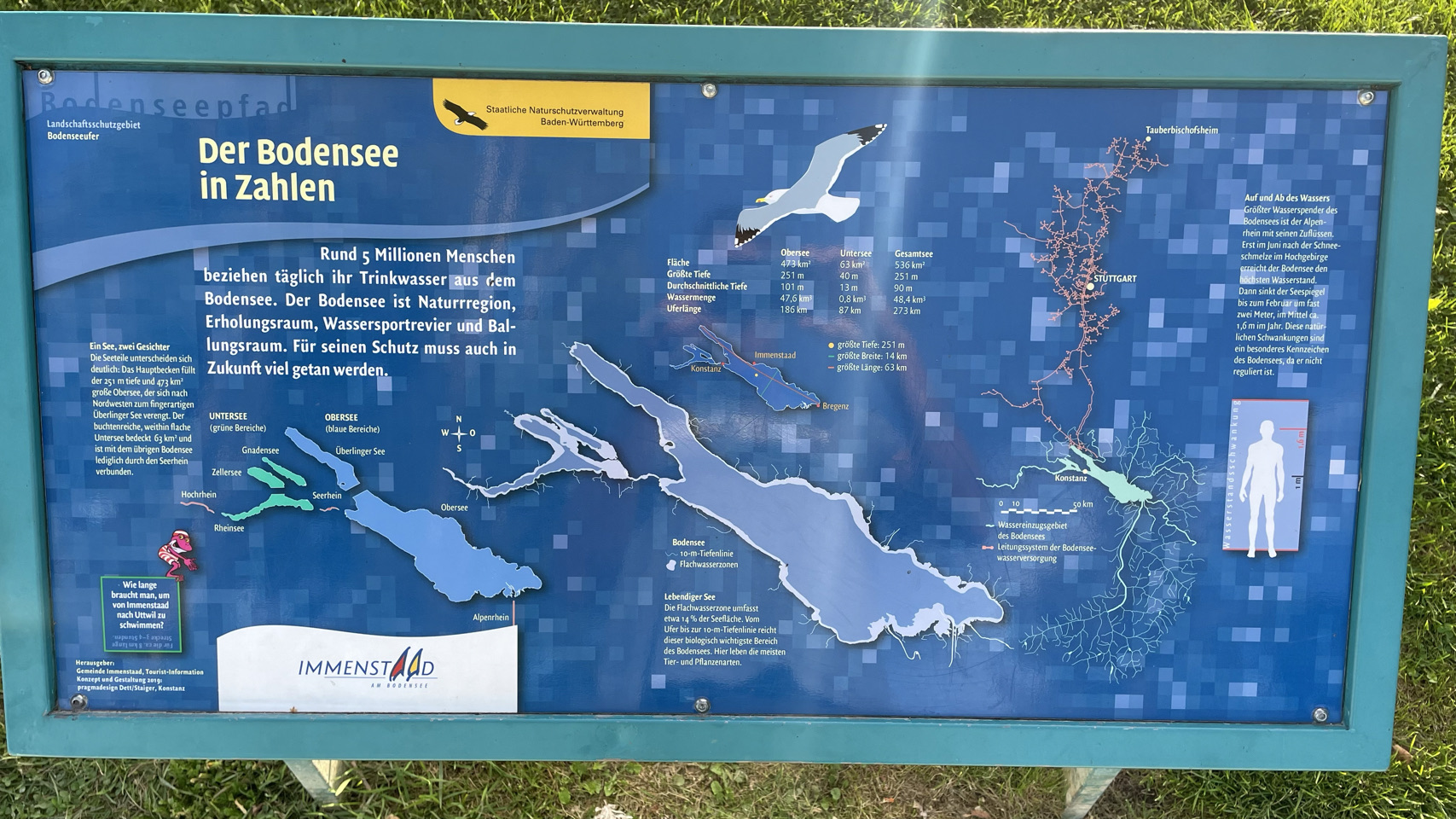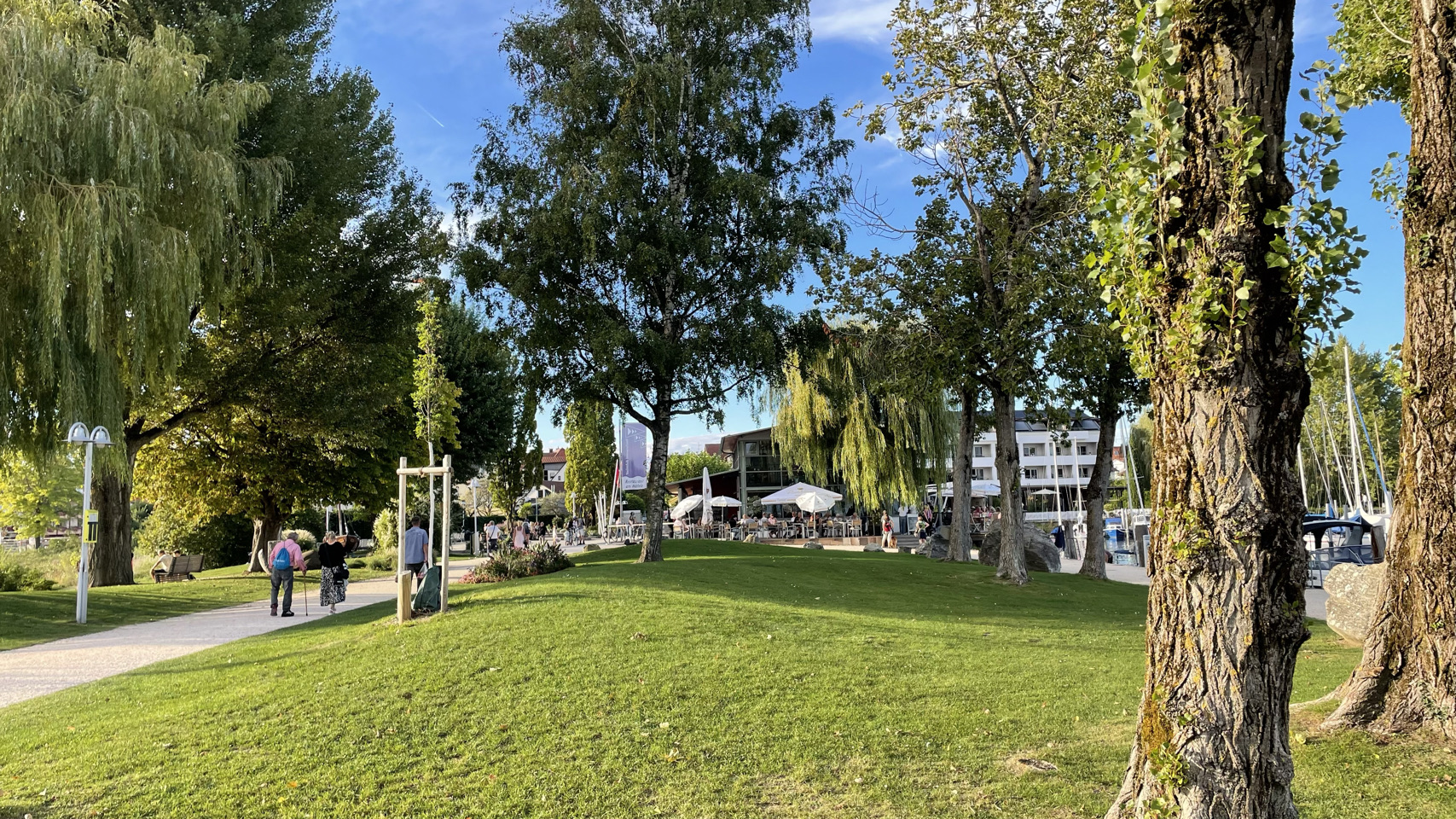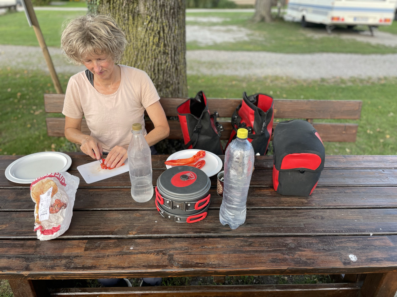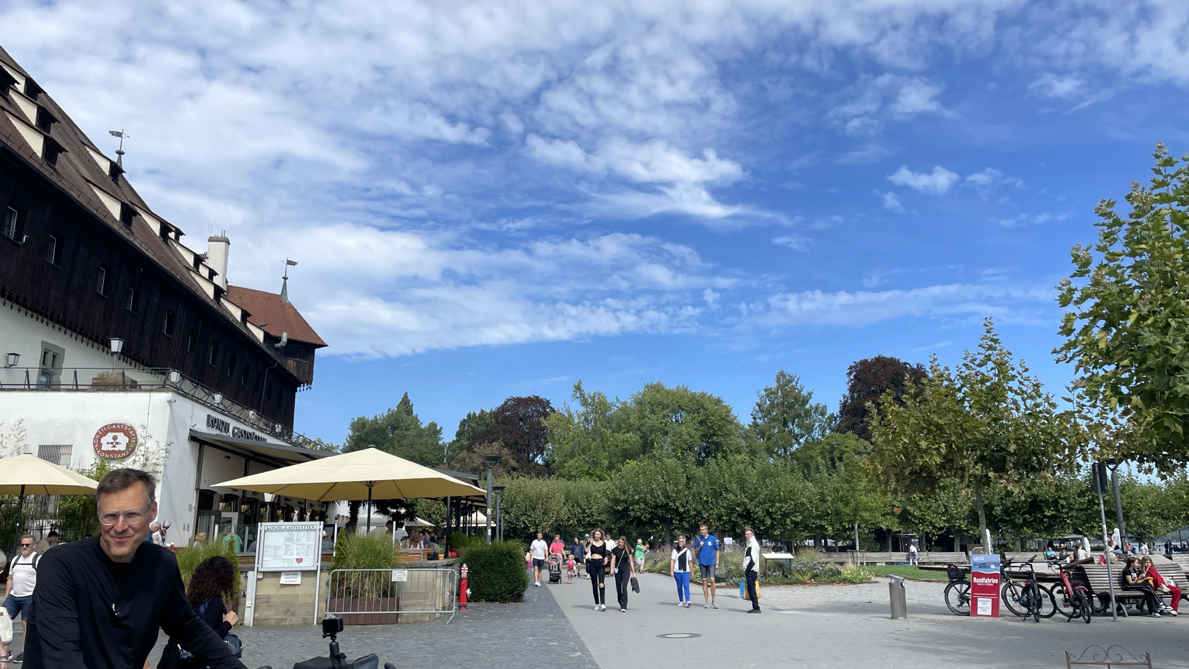 Rondom het water van de Bodensee, als de sfeer zuidelijk wordt, de omgeving nog mooier en de Alpen opdoemen aan de horizon, dan zijn daar ineens kuddes mensen. Ze bevolken de stadjes, boulevards en terrassen en laten zich bij elkaar proppen tussen water en spoor in witte tupperware boxen die ze campers of caravans noemen. We gaan mee in de stroom, via het schiereiland Reichenau en de prachtige stad Kostanz. We fietsen langs de oevers van het meer, maar niet naar Mainau, want de fietsen mogen niet mee én het kost €28 per persoon en zoveel tijd kunnen én willen we daar niet blijven. De veerboot brengt ons van Staad naar Meersburg en iets verder op de camping bij Immenstaad blijkt het volledig vol te zijn. Toch is er op de tentenweide gelukkig nog een plekje voor ons. We eten in Immenstaad en als het donker is gaan we voldaan terug naar de tent. Morgen weer een nieuwe dag…