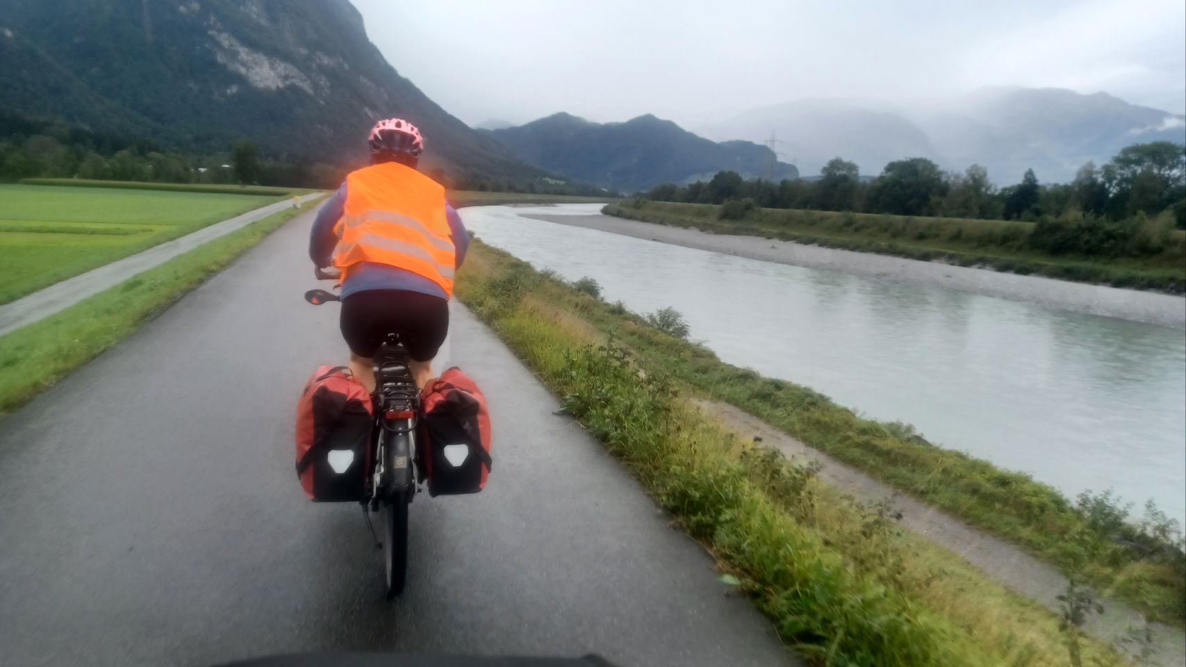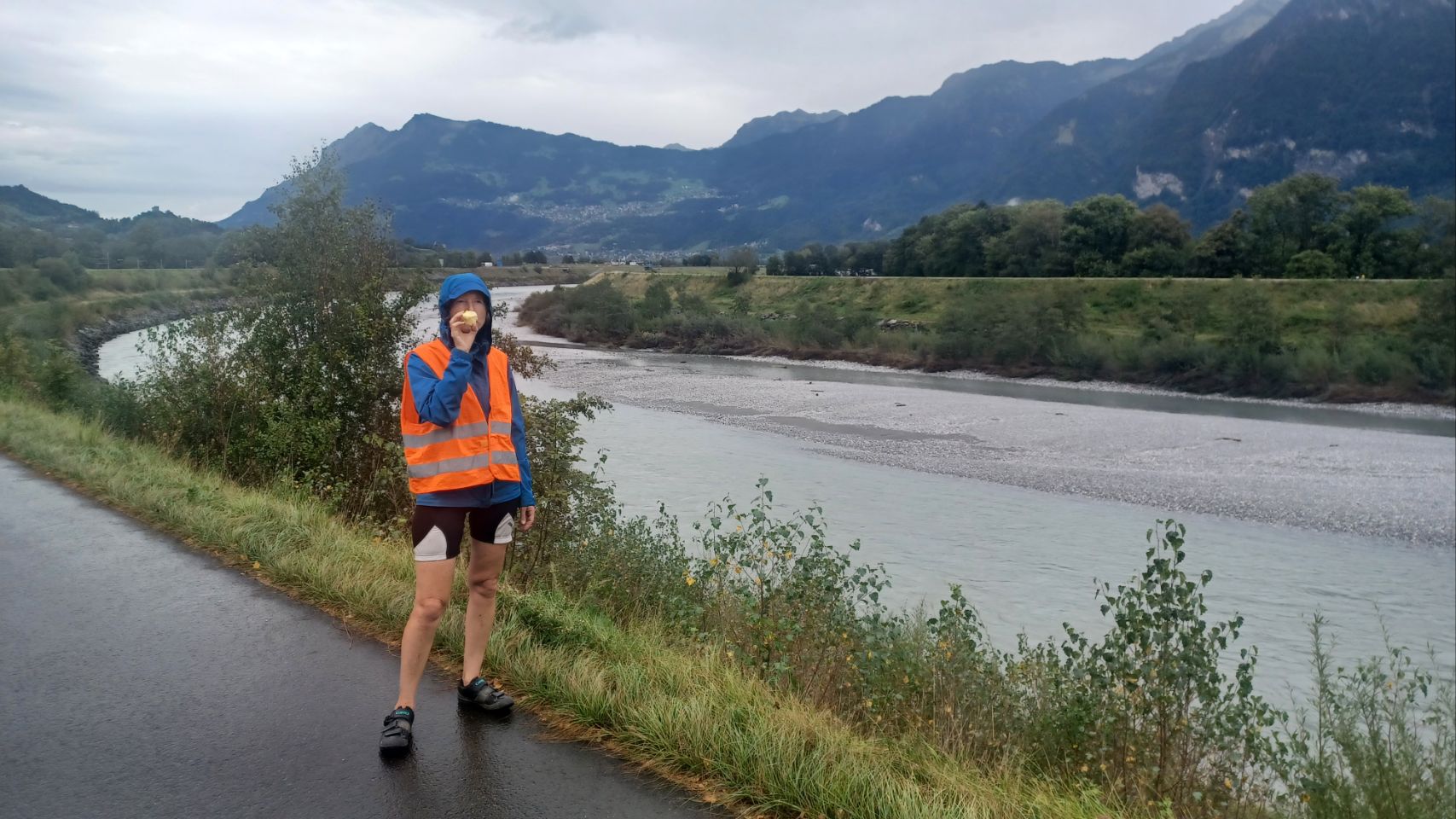 Bij vertrek zorgen heel veel kleine rode torretjes voor vertraging. Bij het opvouwen van de tent zien we hordes ervan op de binnentent en we willen ze niet pletten. Dus zetten we de tent weer op, helen de binnentent eruit, voordat we alles opnieuw opvouwen. We volgen vamdaag grofweg de Rijn naar het zuiden. Het blijkt een regenachtige dag te worden en de koffiebreak die overgaat in lunch doet ons goed. Sijtse improviseert een route die door Vaduz – de hoofdstad van Liechtenstein – gaat. Dan zien we niet slechts de Rijndijk, maar ook iets van dit landje, dat nieuw voor ons is. Het laatste stuk is buffelen, tegen wind en regen, waarbij de halve lunch Sijtse opbreekt. De helft van de eerder ingekochte camembert en de 2 platte perziken zijn “cruciaal” voor Sijtse’s energiehuishouding. Zij slepen hem door de laatste kilometers naar de camping bij Landquart. Morgen gaan we met de trein vanuit Landquart naar Tirano (Italië).