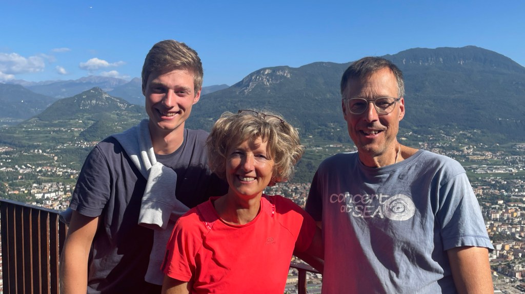 Toch weer fietsen: Op de agricamping Mabellini staat het “echte” 😆 werk. Het staat stampvol met de grootste campers en zelfs versies waarin de buggie of zelfs de Smart auto kan worden opgeslokt. De tent is ’s morgens nat van de condens en we kunnen hem drogen op het speelveld. In de straffe wind en felle zon, droogt alles snel en hebben we ontbijt. We genieten toch wel van onze eenvoudige set-up, met 2 fietsen, tassen en rode tent. We gaan vandaag toch weer gewoon fietsen. We fietsen naar Sirmione, het toeristische schiereiland met historisch stadje op de kop, waar we helaas niet op mogen met onze fietsen. We vervolgen onze weg naar Peschiera del Garda, het volgende leuke, maar toeristische plaatsje. Buiten het hoogseizoen is het nog druk hier. Uiteindelijk doen we 39km naar Domegliara, waar we de trein nemen naar Trento. We hebben de komende 3 nachten een appartement geboekt in Trento, zodat we kunnen zien en beleven waar Eize nu leeft en 6 maanden studeert. Heerlijk om Eize weer te zien in zijn nieuwe (tijdelijke) thuisomgeving😀. Trento: een heerlijk stad: We gebruiken de tijd in Trento om de lokale Italiaanse sfeer te beleven, Eize’s kamer en vrienden/huisgenoten te zien, rond te struinen in de oude en gezellige stad en te wandelen. Donderdag 28 september rijden we met onze auto terug naar huis.
