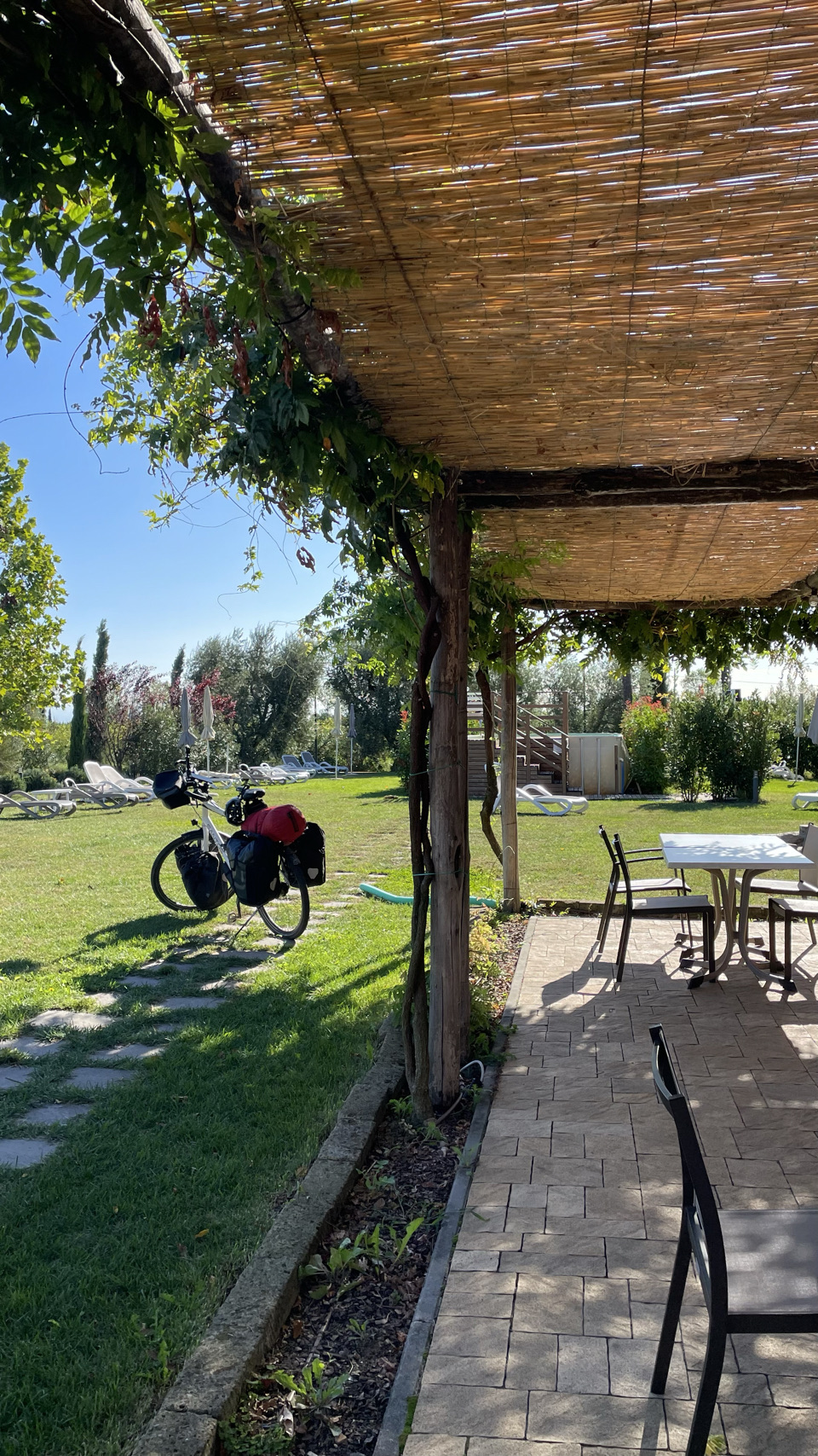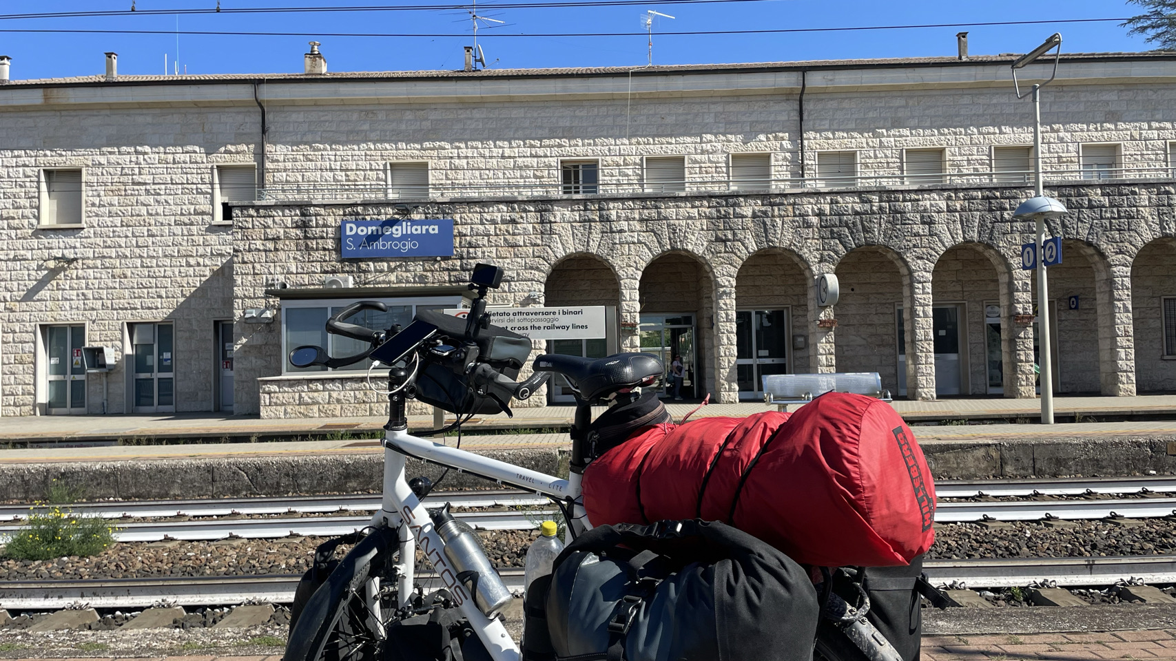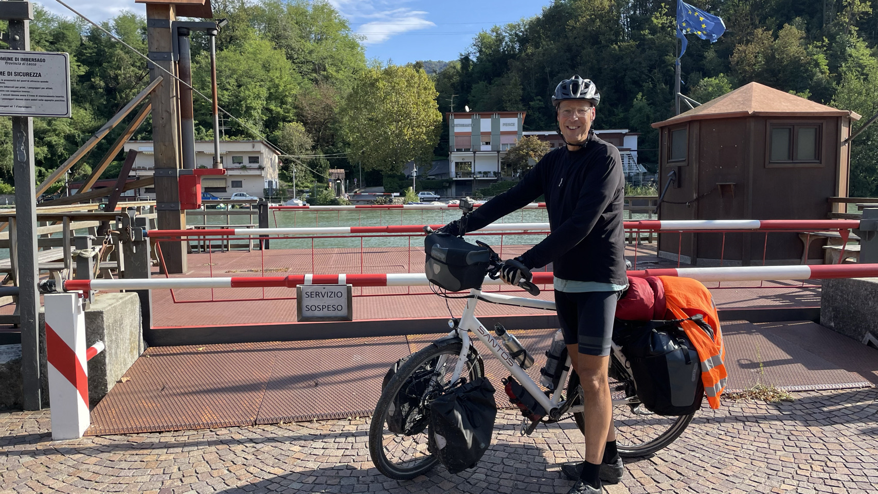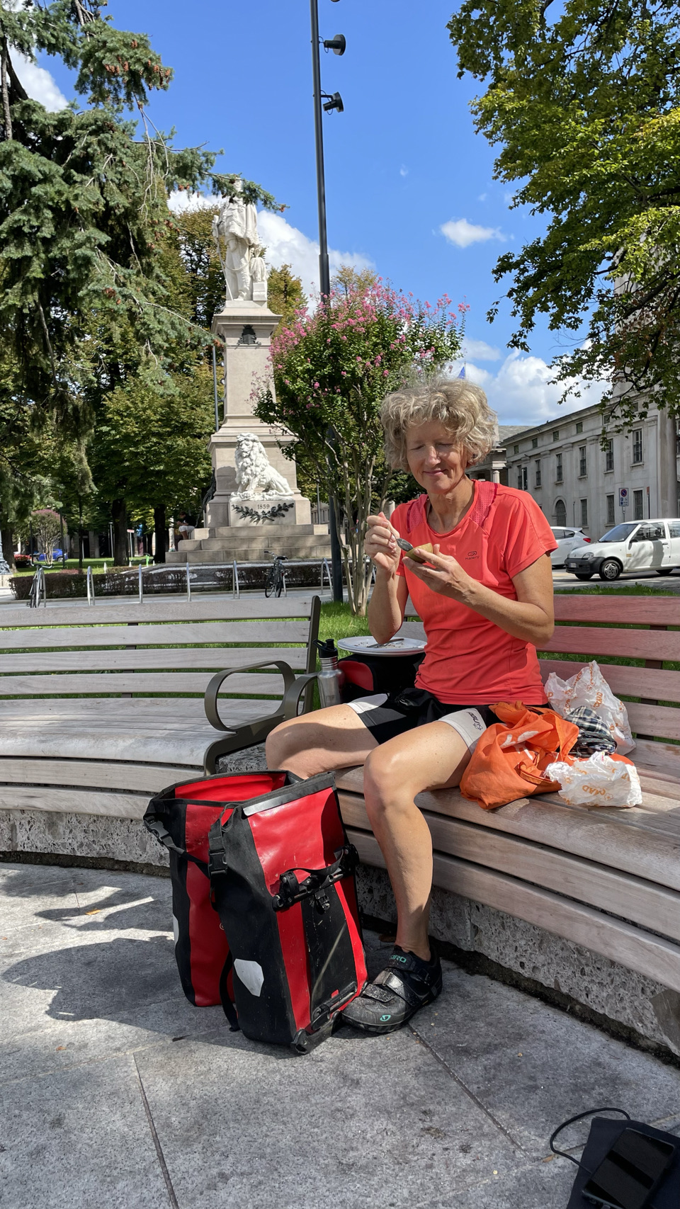 We worden wakker met een schuddende tent van de harde wind. Vóór de wekker van 7h30 staan we op, pakken alles alvast zoveel mogelijk in, want het is nog droog. We zien de Belgische studenten (net als gisteren bijna de hele dag) weer in de openbare ruimte. Zij gaan wandelen en wij gaan na het ontbijt op weg naar Lago d’Iseo. We volgen in de ochtend kilte de rivier de Adda zuidwaarts. Het pondje dat ons naar de andere kant had moet zetten blijkt buiten werking. We moeten dus verder en de volgende rivierovergang blijkt een prachtige brug, maar wel super hoog. We moeten een giga stijle weg omhoog fietsen (in het begin lukt dat nog), maar vooral duwen, zo stijl is deze weg. Met de bergen aan onze linker kant gaan we richting Bergamo, met veel “sluipdoor-kruipdoor” weggetjes. Al snel verschijnen de voorsteden van Bergamo. We kopen heerlijk bruinbrood bij de Lidl – best wel ons favoriete supermarkt o.a. vanwege hun heerlijke verse brood. Drinken 2 Americanos (espresso met extra heetwater) voor 2,60€ in totaal 😀. Lunch is in hartje Bergamo, maar wel op de fietsers manier (dus brood, beleg en water in het stadspark – zie foto). Met wat doorsteken en stukjes fietsen op grotere wegen weten we uiteindelijk na 80km bij Lago d’Iseo een camping te bereiken. Volop vergane glorie en vaste staanders, maar ja, we willen een plek voor de tent, eten en dan slapen. Prima dus. Morgen naar het Gardameer, waarbij we op zoek zullen gaan naar een camping niet direct aan het meer. Dat soort campings hebben we niet veel mee.