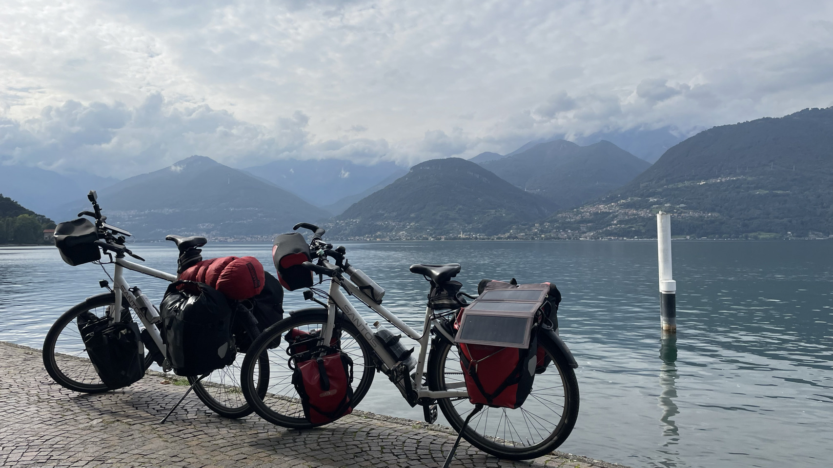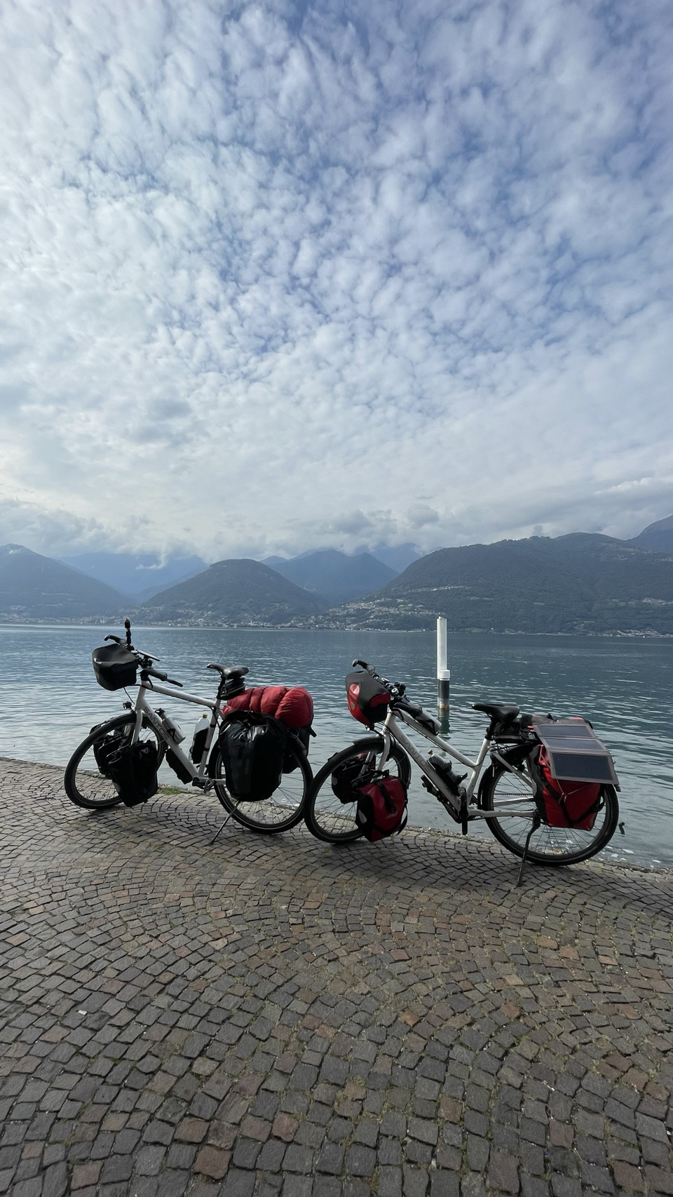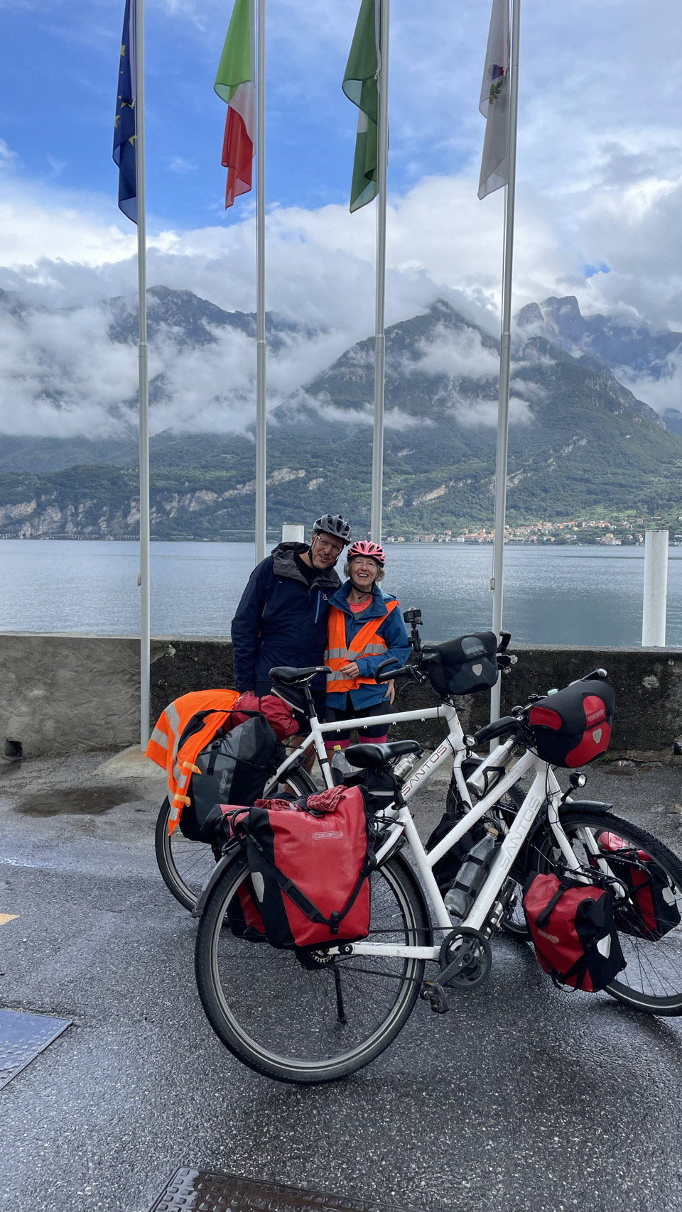 Italië en fietsers die een flink ontbijt willen 🤔: nou dat zat wel goed in ons hotel. Bon Giorno met lekkere broodjes, fruit met yoghurt, eitje erbij, stukje appeltaart voor Irma en cruesli met yoghurt voor Sijtse. Extra kop koffie is ook geen probleem. Helemaal top Giorno 😀. De meeste spullen waren uit de tassen gehaald om te drogen, dus die moeten allemaal weer ingepakt. Wat een zootje maken we telkens weer als we eens in een hotel slapen. Ook bijzonder is dat veel van je spullen vochtig zijn na een nacht kamperen en dat al je spul klam de tassen in gaat. We willen vandaag een camping aan het Comomeer bereiken en dat is ongeveer 80km. Met een licht dalende trend is dat prima haalbaar. We zeggen bon giorno tegen iedereen die we tegenkomen en ze zeggen allemaal luid en enthousiast bon giorno terug. Echt toppie. We zijn helemaal in Italië. We drinken koffie in Sondrio en doen wat boodschappen voor de lunch. Grappig dat het echt een ander land is en dat best een beetje wennen is. Opvallend blijft dat de mensen super aardig zijn. Na een vervelende omleiding via een drukke weg, komen we eind van de dag bij Colico bij het Comomeer aan. Prachtige omgeving: meer & bergen. Iets zuidelijker aan het meer vinden we een prima camping. Er wordt zwaar weer verwacht vanavond en het regent nu, zodat deze tekst in de tent getypt wordt. De komende 2 dagen wordt ook veel regen verwacht. We gaat maar eens zien wat het wordt. Vandaag was in ieder geval een bon giorno 😎❤️🖐.