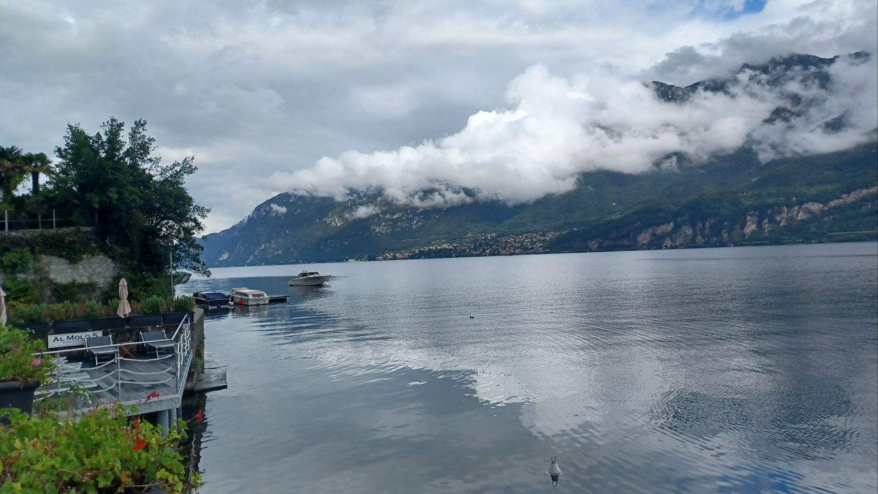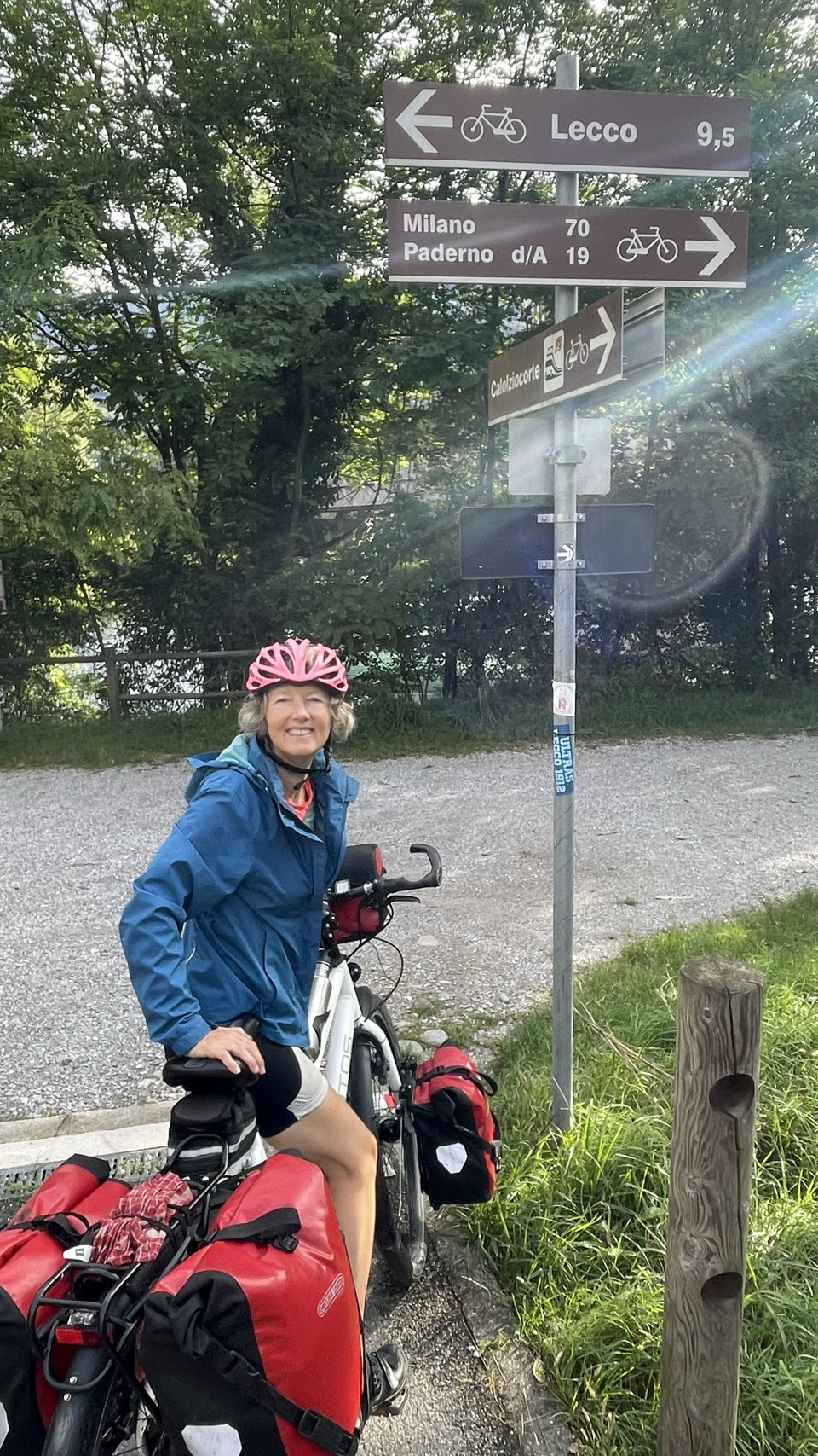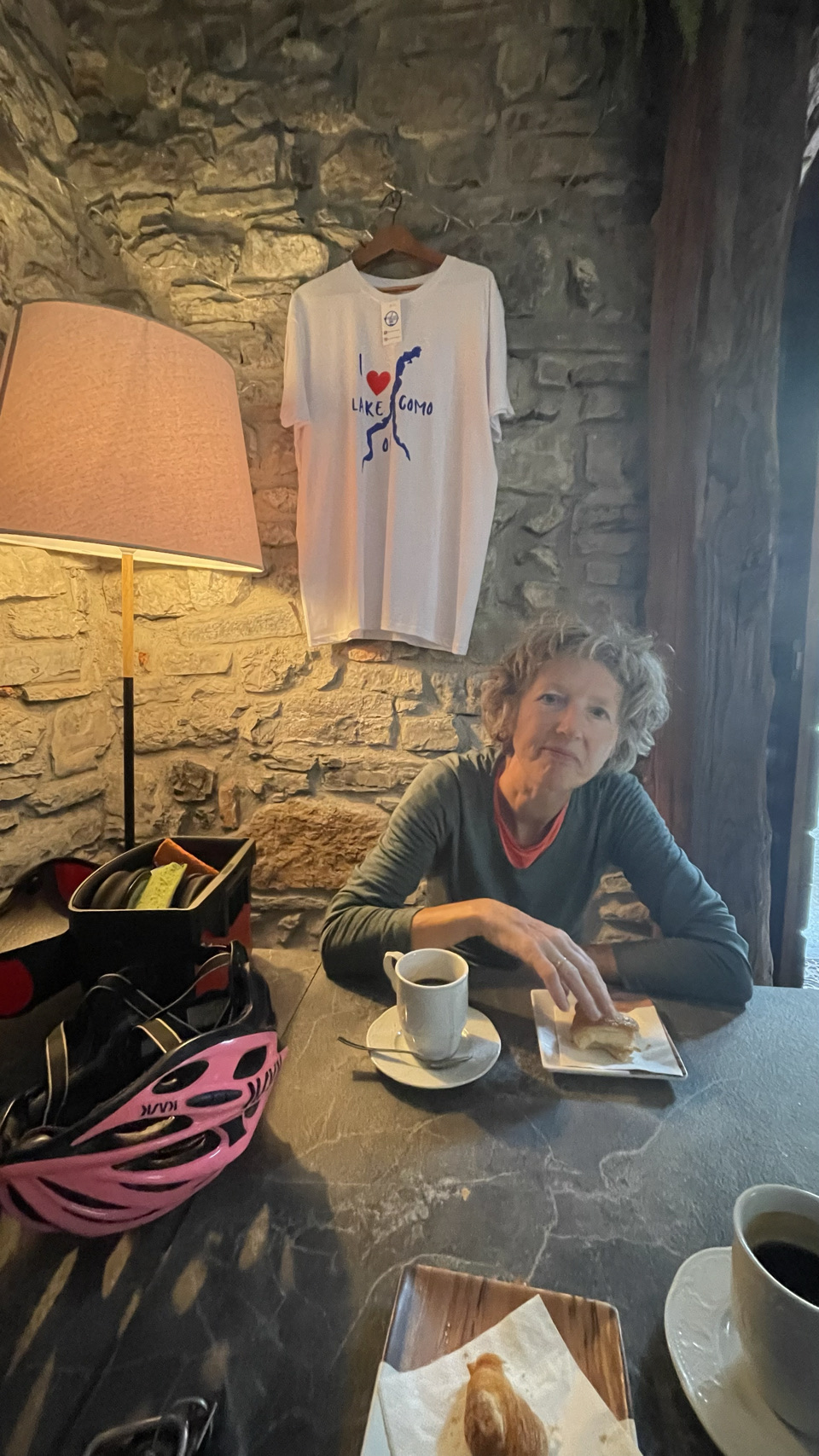 Italië en fietsers die een flink ontbijt willen 🤔: nou dat zat wel goed in ons hotel. Bon Giorno met lekkere broodjes, fruit met yoghurt, eitje erbij, stukje appeltaart voor Irma en cruesli met yoghurt voor Sijtse. Extra kop koffie is ook geen probleem. Helemaal top Giorno 😀. De meeste spullen waren uit de tassen gehaald om te drogen, dus die moeten allemaal weer ingepakt. Wat een zootje maken we telkens weer als we eens in een hotel slapen. Ook bijzonder is dat veel van je spullen vochtig zijn na een nacht kamperen en dat al je spul klam de tassen in gaat. We willen vandaag een camping aan het Comomeer bereiken en dat is ongeveer 80km. Met een licht dalende trend is dat prima haalbaar. We zeggen bon giorno tegen iedereen die we tegenkomen en ze zeggen allemaal luid en enthousiast bon giorno terug. Echt toppie. We zijn helemaal in Italië. We drinken koffie in Sondrio en doen wat boodschappen voor de lunch. Grappig dat het echt een ander land is en dat best een beetje wennen is. Opvallend blijft dat de mensen super aardig zijn. Na een vervelende omleiding via een drukke weg, komen we eind van de dag bij Colico bij het Comomeer aan. Prachtige omgeving: meer & bergen. Iets zuidelijker aan het meer vinden we een prima camping. Er wordt zwaar weer verwacht vanavond en het regent nu, zodat deze tekst in de tent getypt wordt. De komende 2 dagen wordt ook veel regen verwacht. We gaat maar eens zien wat het wordt. Vandaag was in ieder geval een bon giorno 😎❤️🖐.